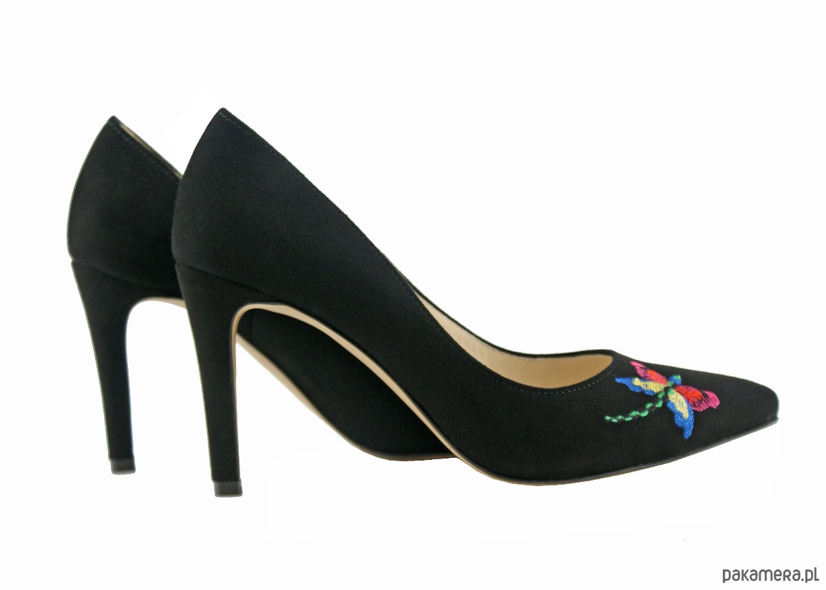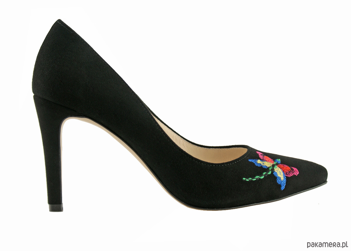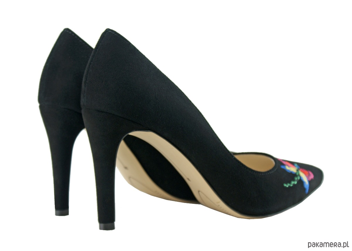 Eleganckie czółenka ze skóry naturalniej, zamszowej, na szpilce, ozdobny haft.