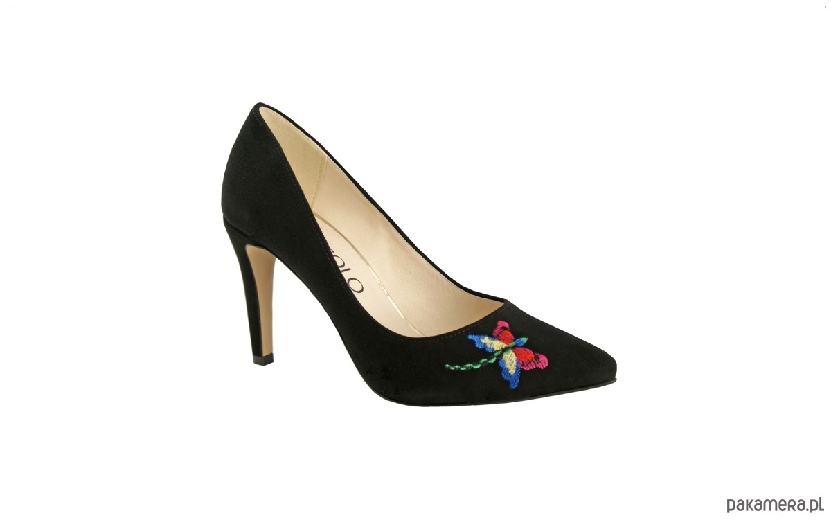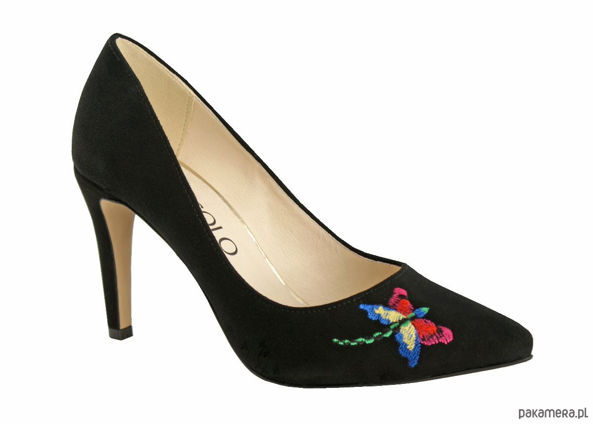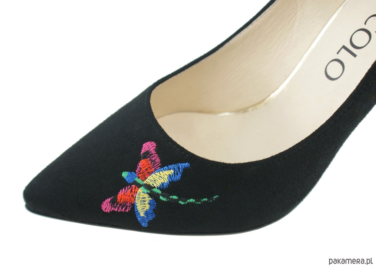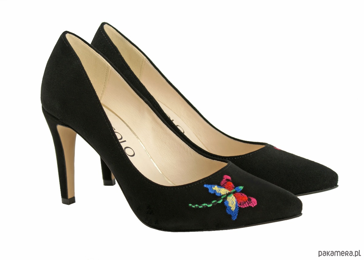Eleganckie czółenka ze skóry naturalniej, zamszowej, na szpilce, ozdobny haft.