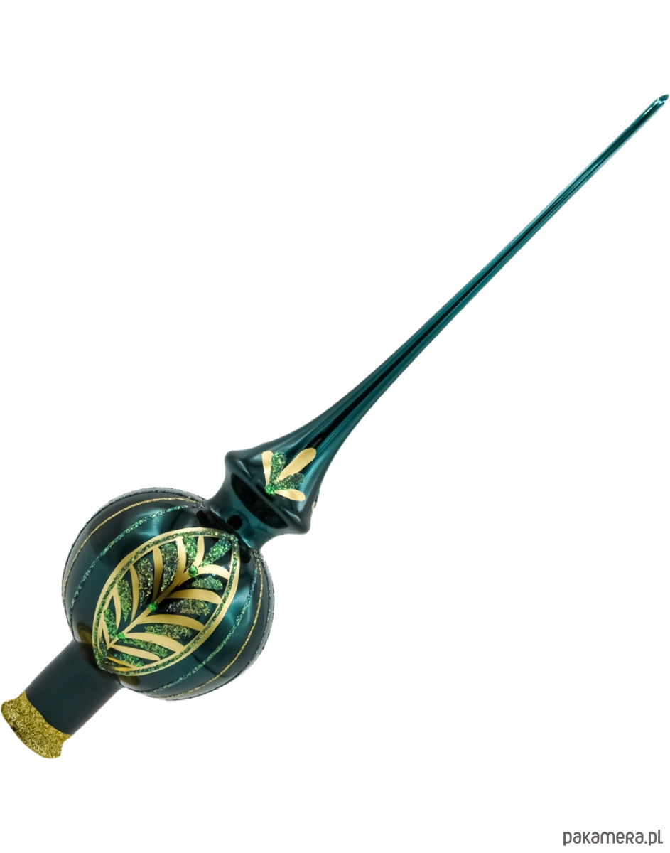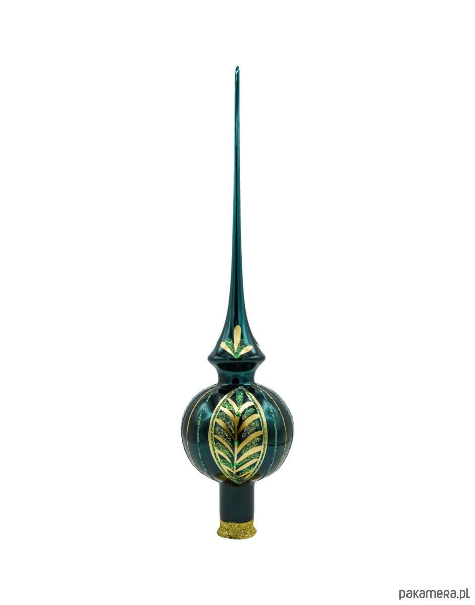 Ten elegancki szklany czubek na choinkę w głębokim odcieniu butelkowej zieleni to esencja klasyki i świątecznego blasku. Smukła, wysoka forma zakończona strzelistym wierzchołkiem doskonale wieńczy każdą choinkę, a bogato zdobiona kula dolna przyciąga wzrok dekoracyjnym motywem liścia – wykonanym z połyskującego brokatu i złotych konturów.