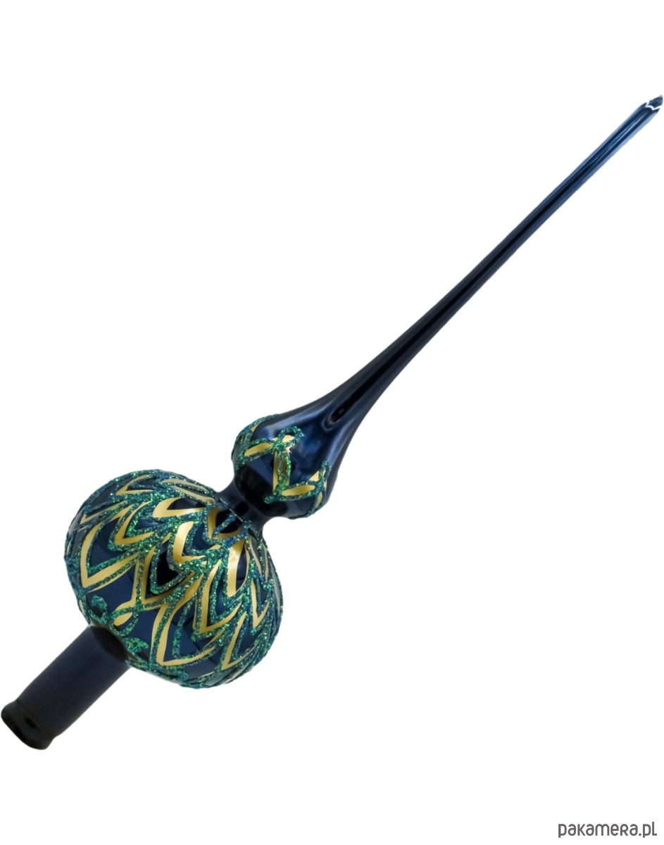 Wzbogać swoją choinkę o wyjątkowy akcent w postaci szklanego czubka „Wieczorna Zieleń”, który przyciąga wzrok głębokim odcieniem granatu przechodzącym w butelkową zieleń, ozdobionym ręcznie nanoszonymi zdobieniami ze złotego lakieru i zielonego brokatu. To elegancka i szlachetna propozycja dla miłośników klasycznych, a jednocześnie wysmakowanych dekoracji świątecznych.