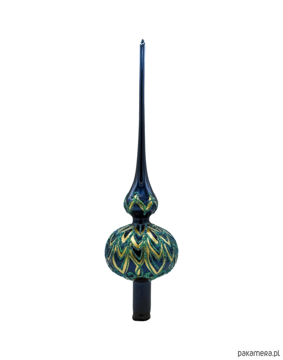 Czubek charakteryzuje się smukłą, stożkowatą formą o wysokim zakończeniu oraz kulistą podstawą ozdobioną misternym, choinkowym wzorem ze złotych konturów i zielonych brokatowych liści. Całość sprawia wrażenie lekkości i harmonii, a delikatny połysk szkła odbija światło choinkowych lampek, tworząc magiczną aurę.