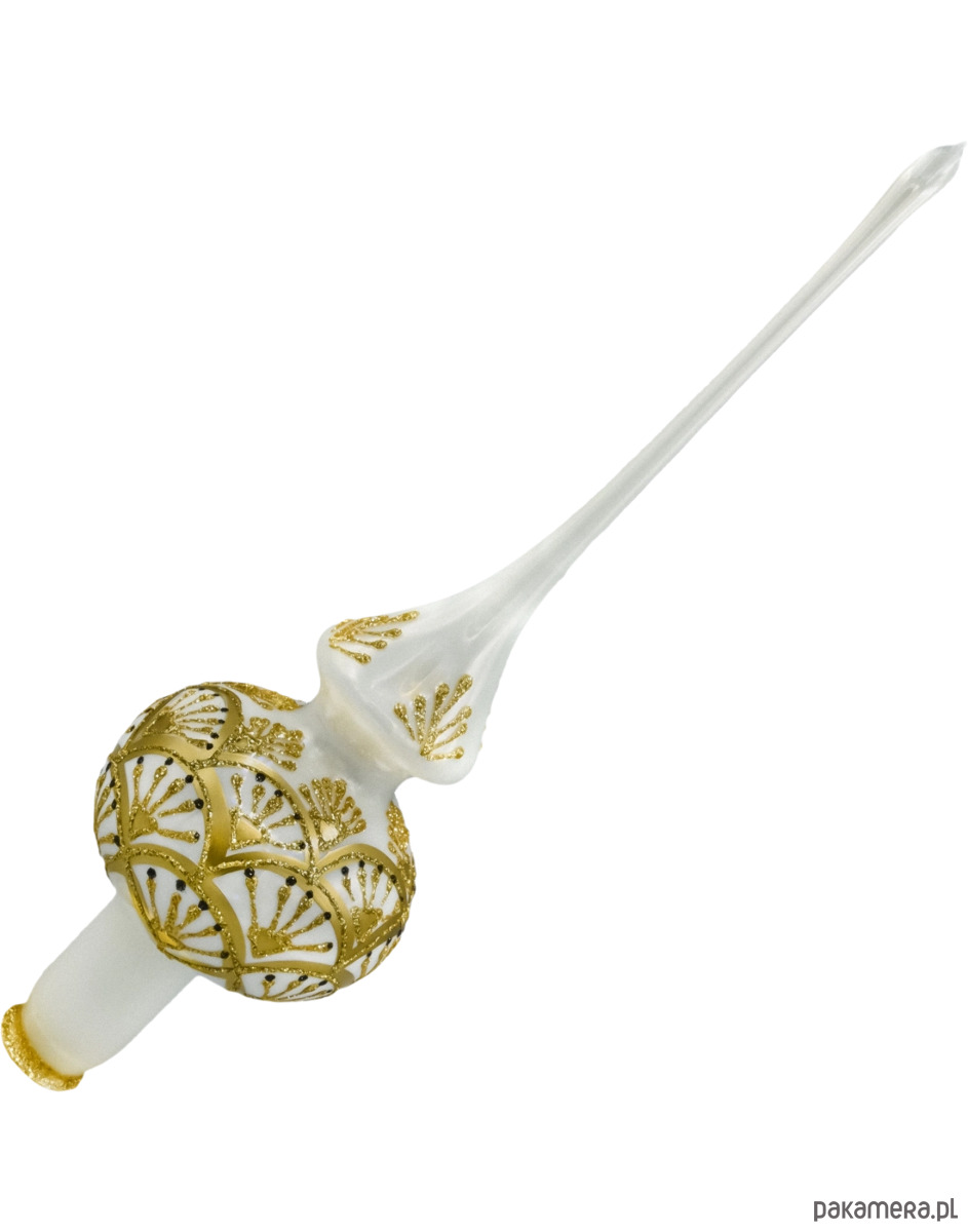 Wytworny szklany czubek na choinkę w eleganckiej biało-złotej kolorystyce to wyjątkowa ozdoba, która stanie się symbolicznym zwieńczeniem każdej świątecznej dekoracji. Ręcznie zdobiony precyzyjnym motywem wachlarzy w odcieniach lśniącego złota i czerni, ten szpic urzeka misterną kompozycją i klasycznym wdziękiem.