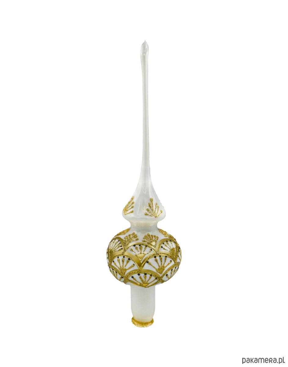 Gładka, perłowa powierzchnia czubka pięknie odbija światło, a delikatne, złocone zdobienia w stylu art déco dodają mu szlachetności i wytworności. Czubek został wykonany ze szkła dmuchanego tradycyjną metodą, co czyni go lekkim, ale wyjątkowo dekoracyjnym elementem. Jego harmonijne proporcje i wyraźnie wysmuklony kształt nadają choince majestatyczny charakter.