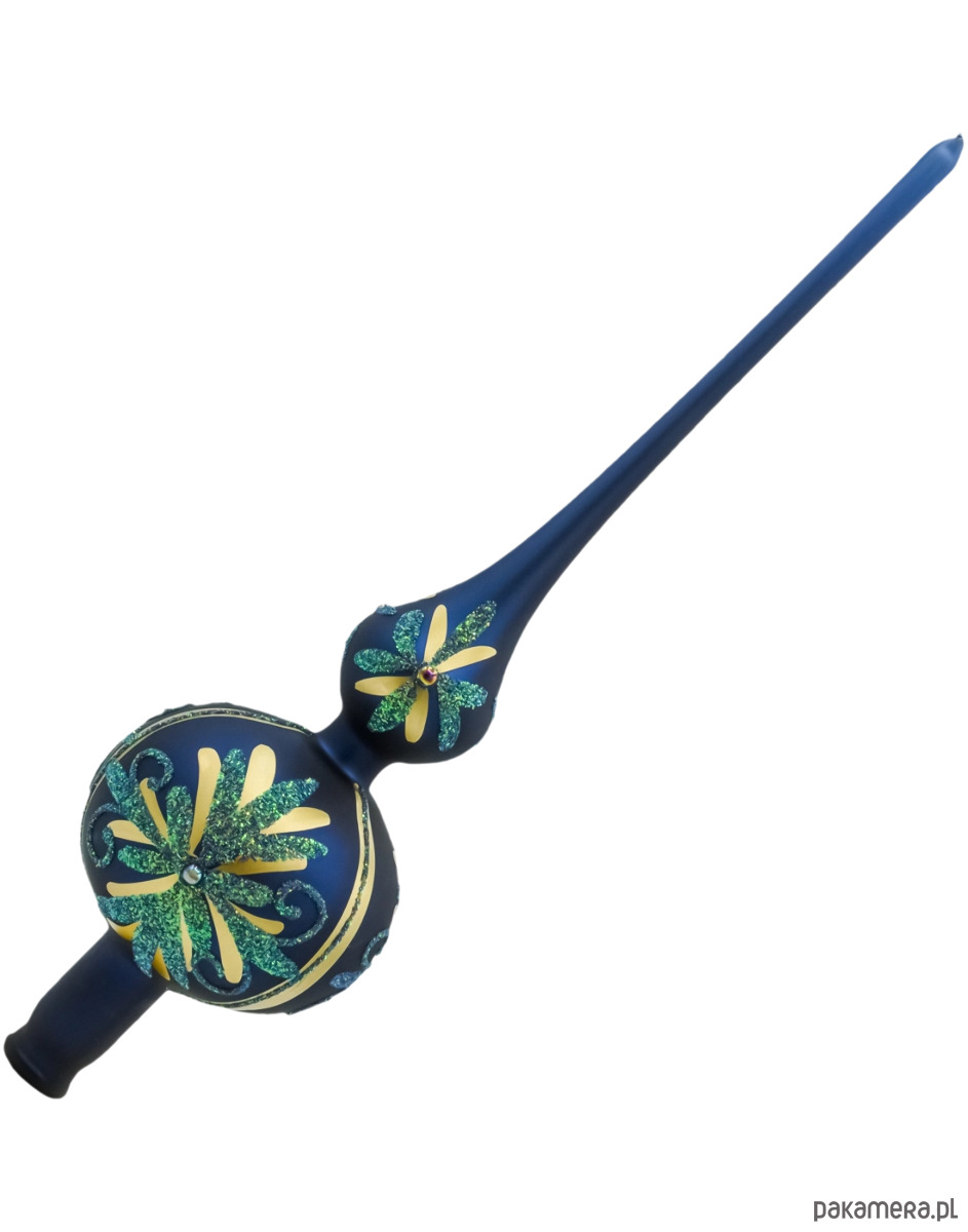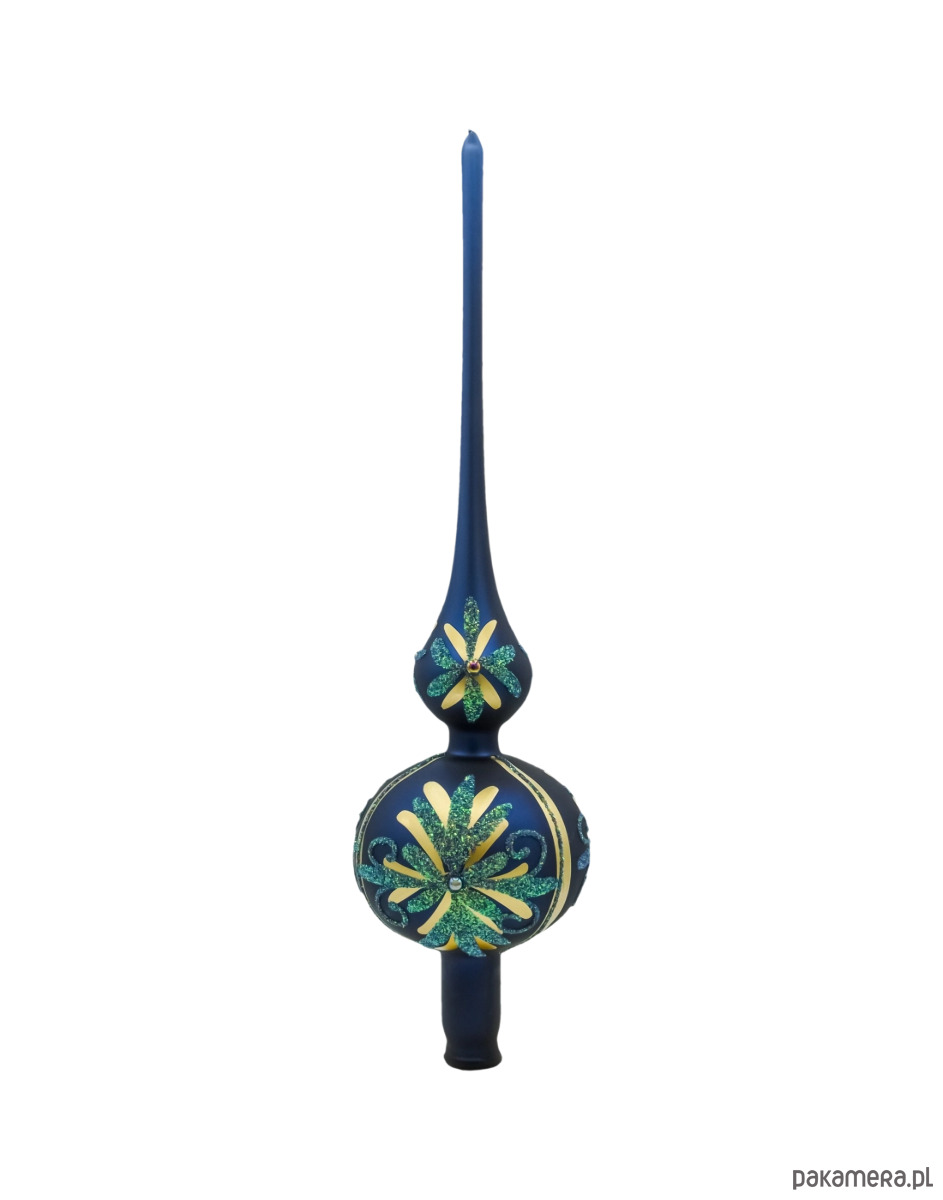 Czubek na choinkę „Szafirowa Gwiazda” to kwintesencja świątecznej elegancji w artystycznym wydaniu. Ręcznie wykonany z dmuchanego szkła, czaruje głębokim, matowym odcieniem szafiru i olśniewającymi dekoracjami w kolorze zieleni i złota. Wyjątkową ozdobę stanowią ornamenty w formie rozkwitających gwiazd – wykonane z brokatu i błyszczących aplikacji – które nadają bombce trójwymiarowego efektu i luksusowego charakteru.