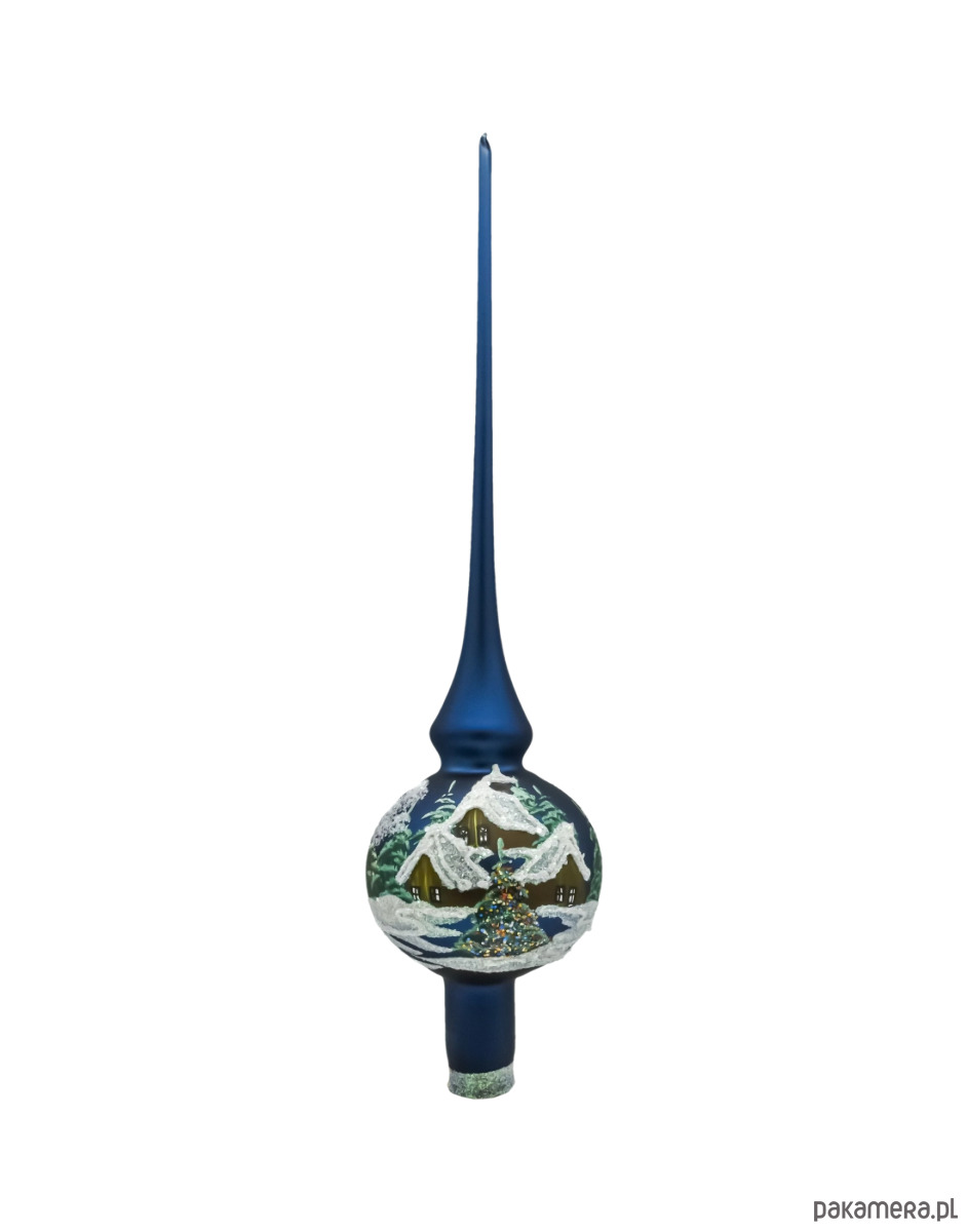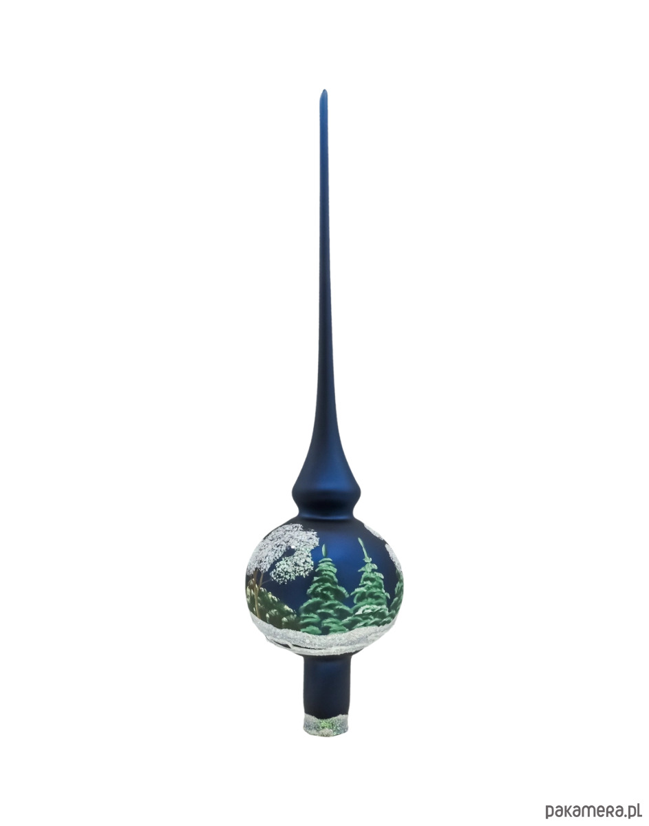 Ten wyjątkowy szklany czubek na choinkę w głębokim odcieniu granatu to połączenie klasycznej formy z niezwykłą sztuką malarską. Ręcznie zdobiony pejzaż przedstawiający ośnieżone domy, świąteczne drzewko i zimowy las przenosi wprost do magicznej krainy Bożego Narodzenia. Każdy szczegół – od brokatowego śniegu po roziskrzone światełka choinki – malowany jest z ogromną precyzją i sercem.