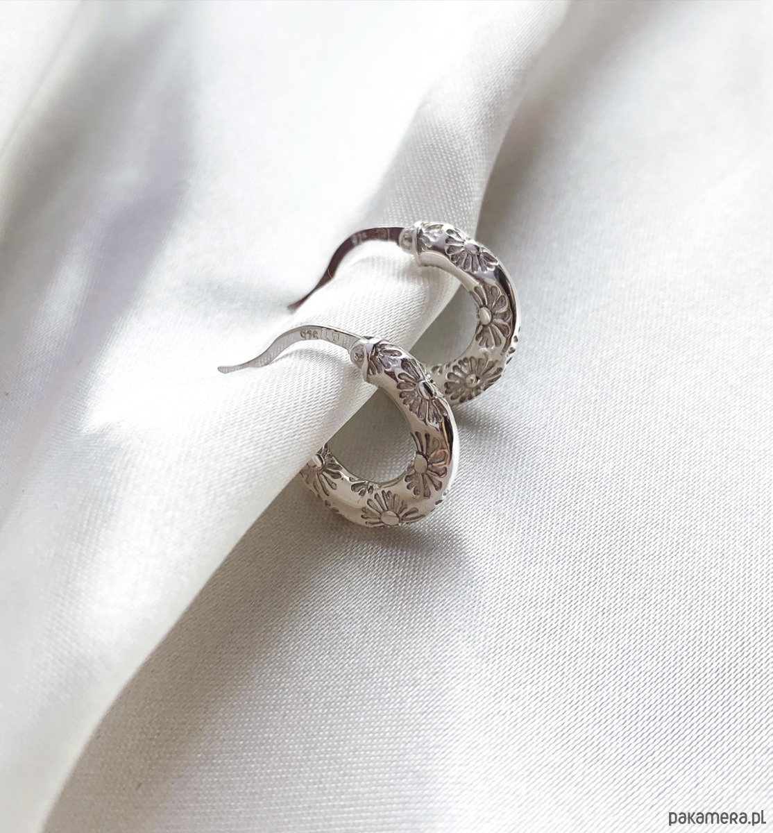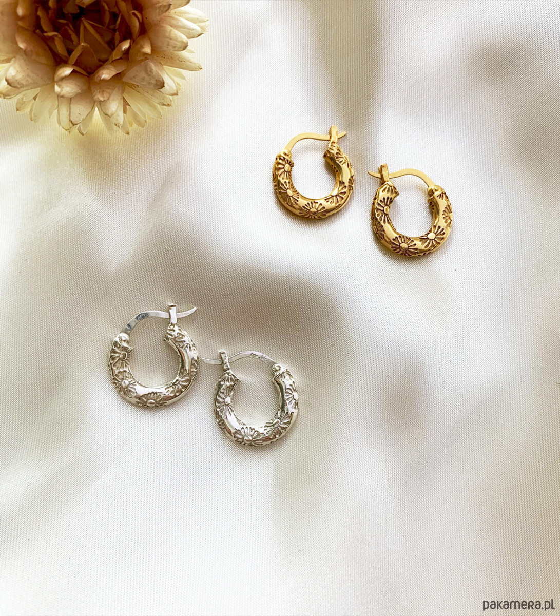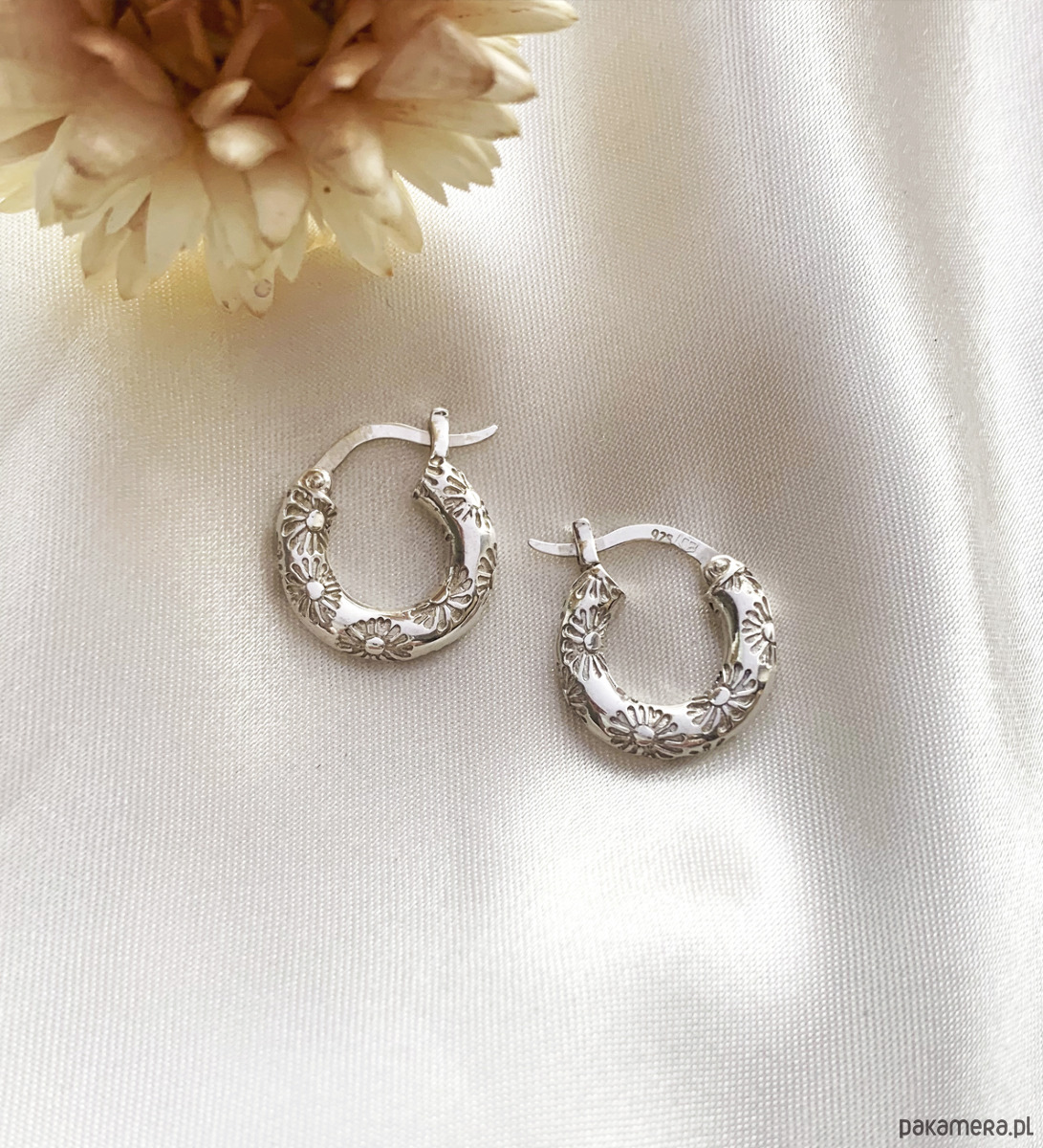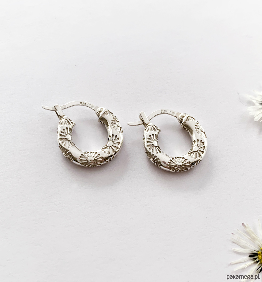 Daisy, kolczyki oponki w stylu vintage z delikatnym, wklęsłym grawerem w stokrotki.