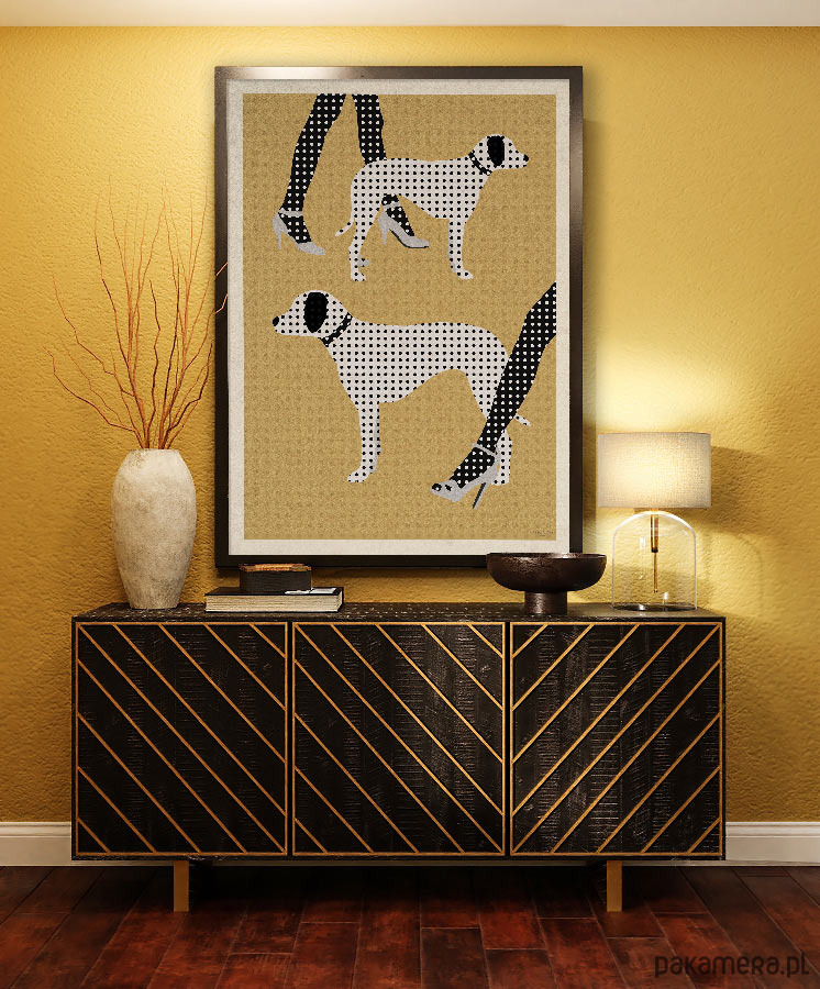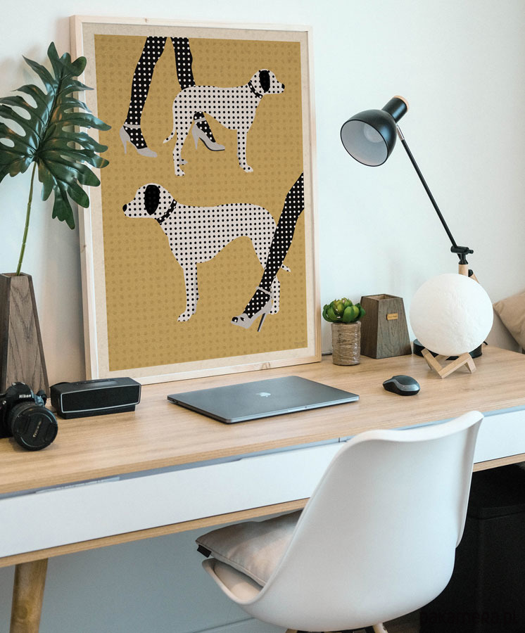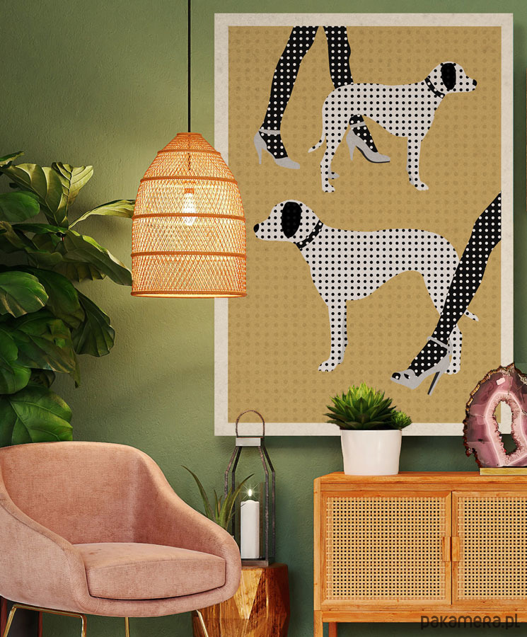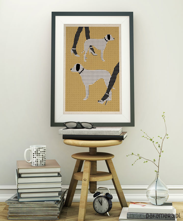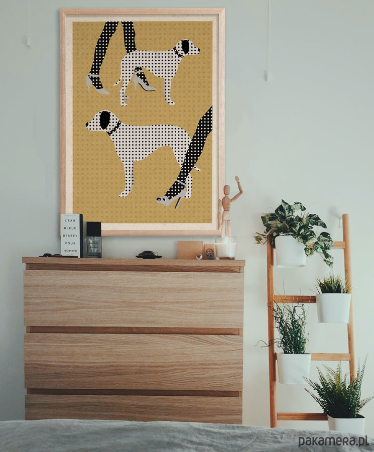 Plakat z autorską grafiką przedstawiającą psy (dalmatyńczyki) na spacerze.
