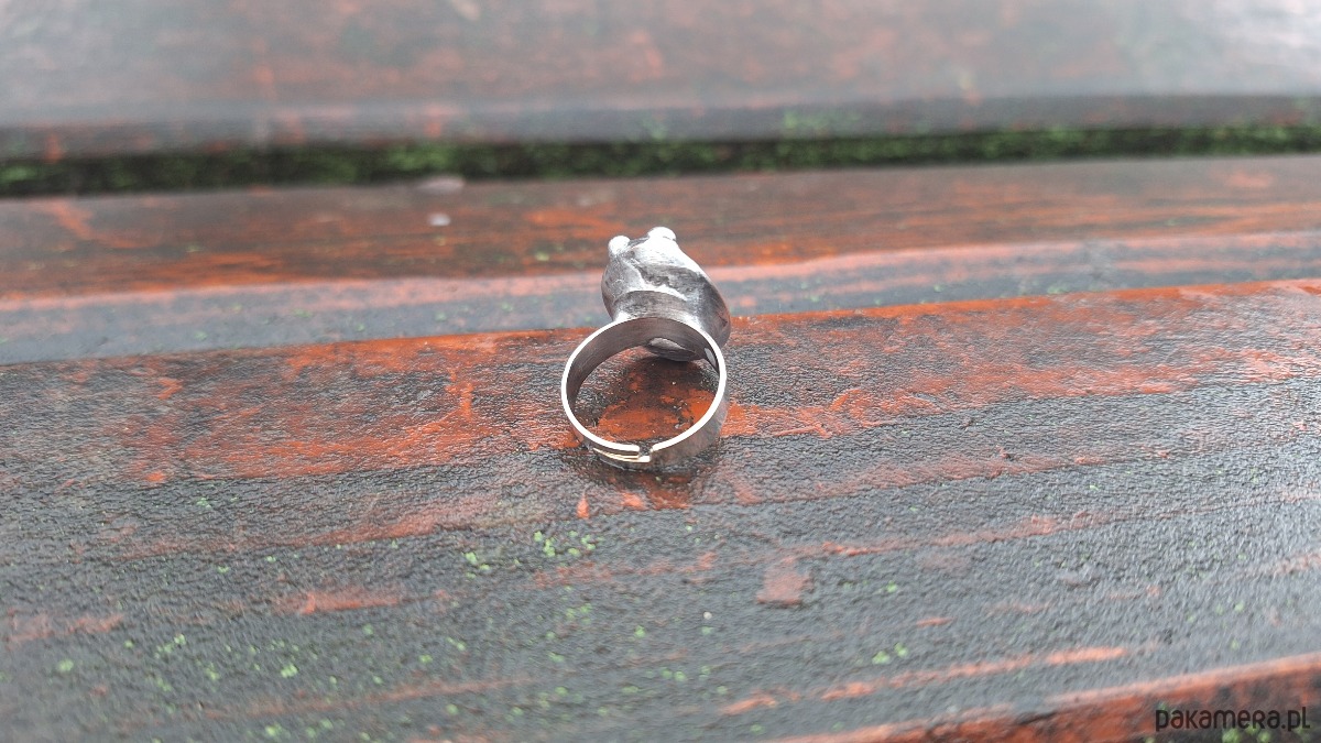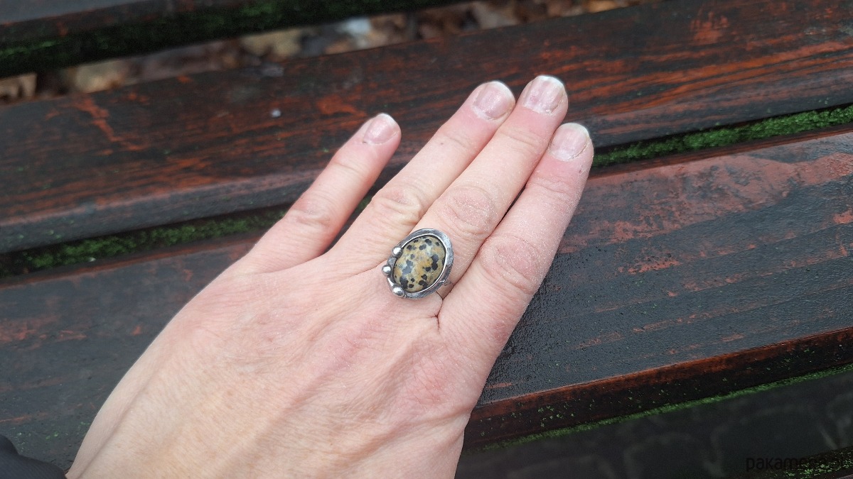 Pierścionek wykonany z miedzi, cyny i jaspisu. Wymiary ok. 2 na 1.5 cm. Regulowany. Nie jest ciężki.