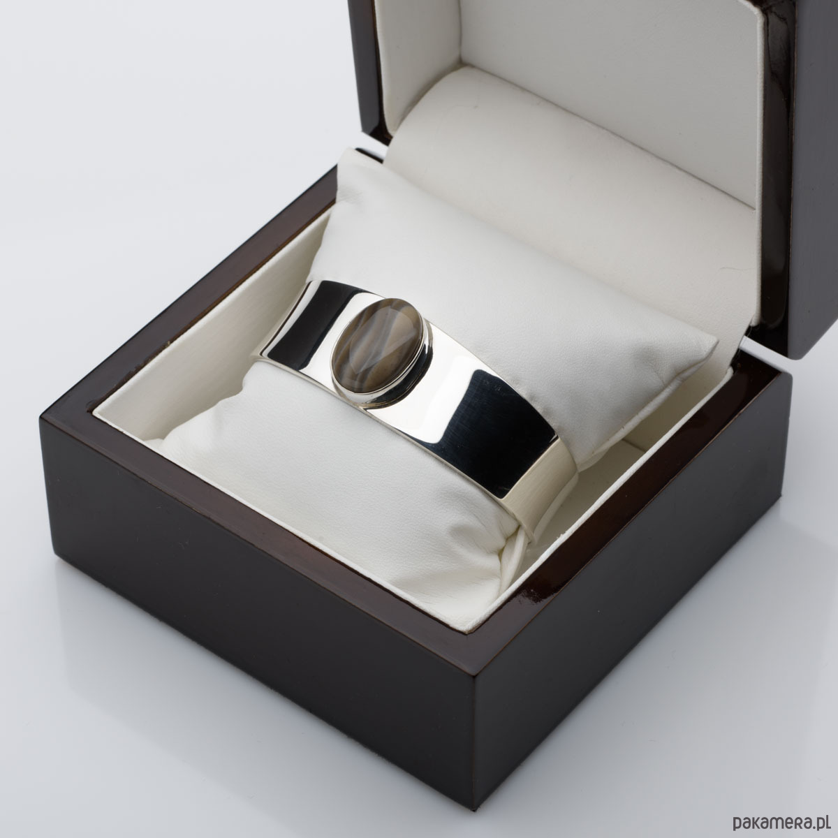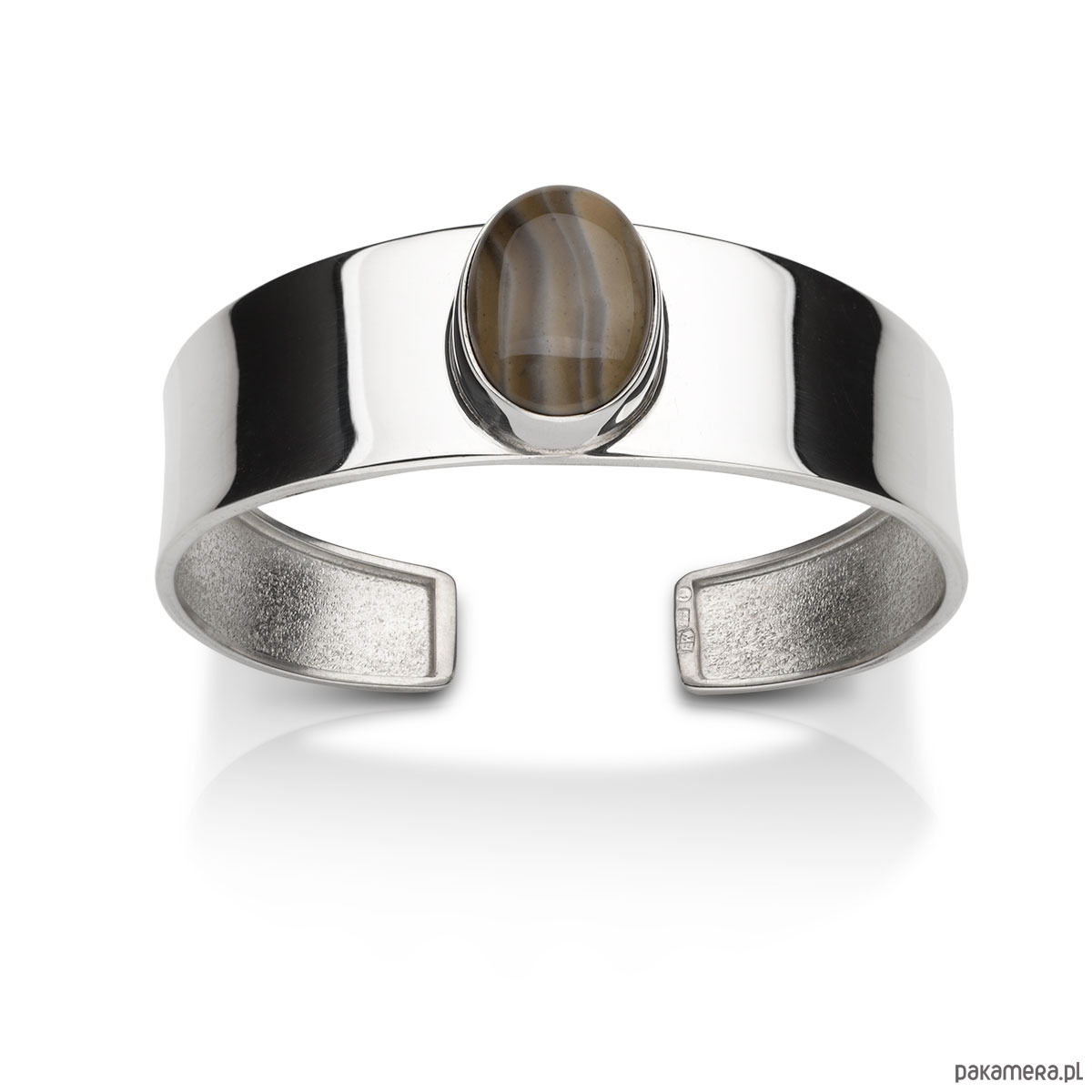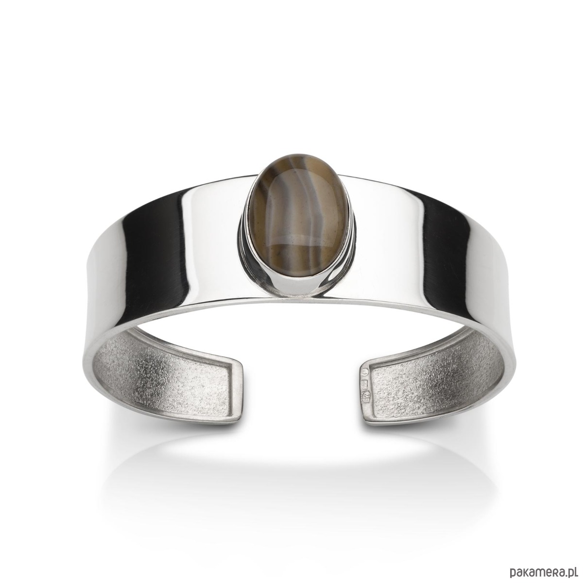 Okazała bransoleta wykonana ze srebra próby 925 z krzemieniem pasiastym - kamieniem optymizmu, występującym jedynie w Polsce kamieniem szlachetnym, zwanym także "polskim diamentem".