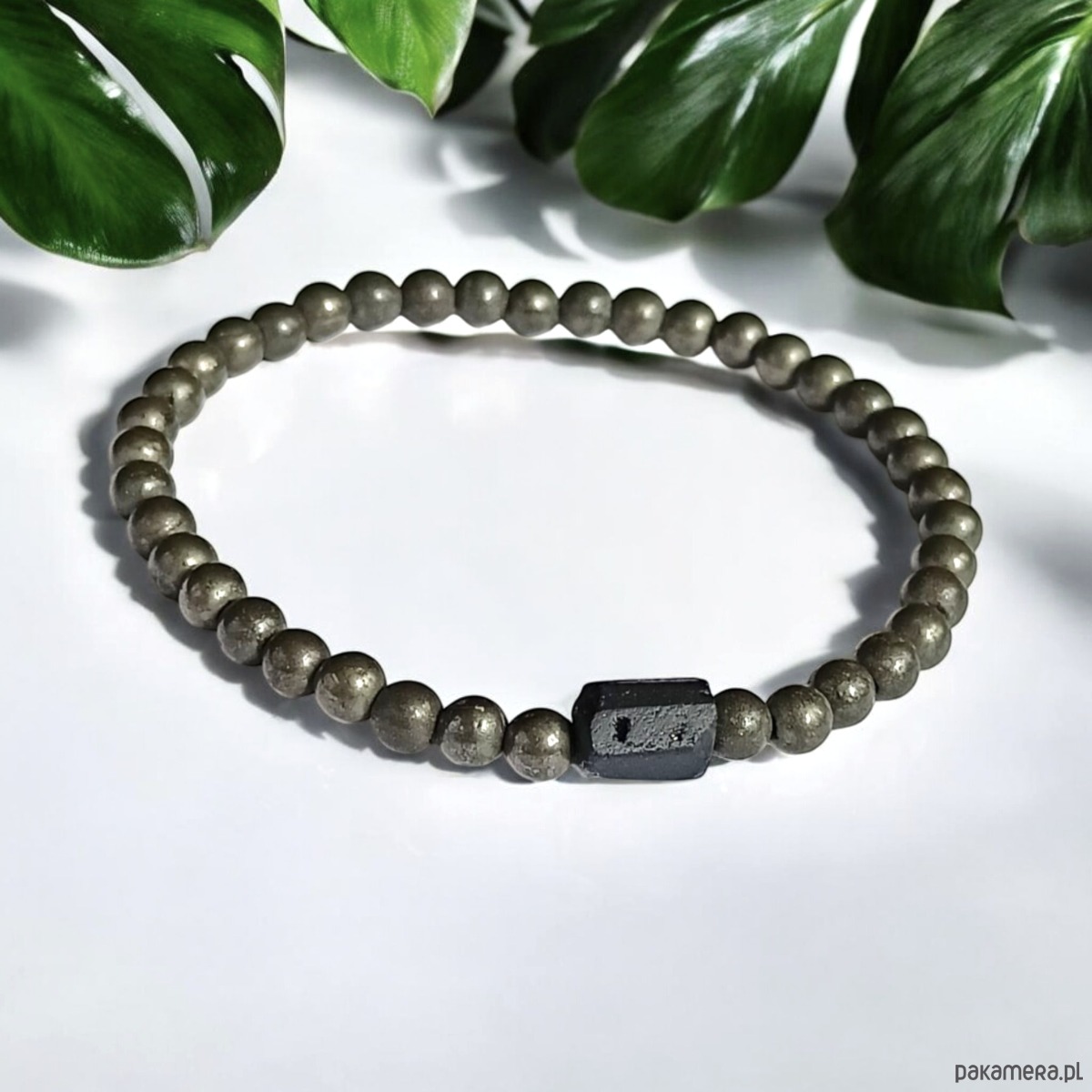 delikatna, niezwykle ciekawa bransoletka- talizman wykonana z półmatowego, ciemnozłotego pirytu (kuleczki 4mm) i niewielkiej, surowej bryłki czarnego turmalinu (ok.8mm)