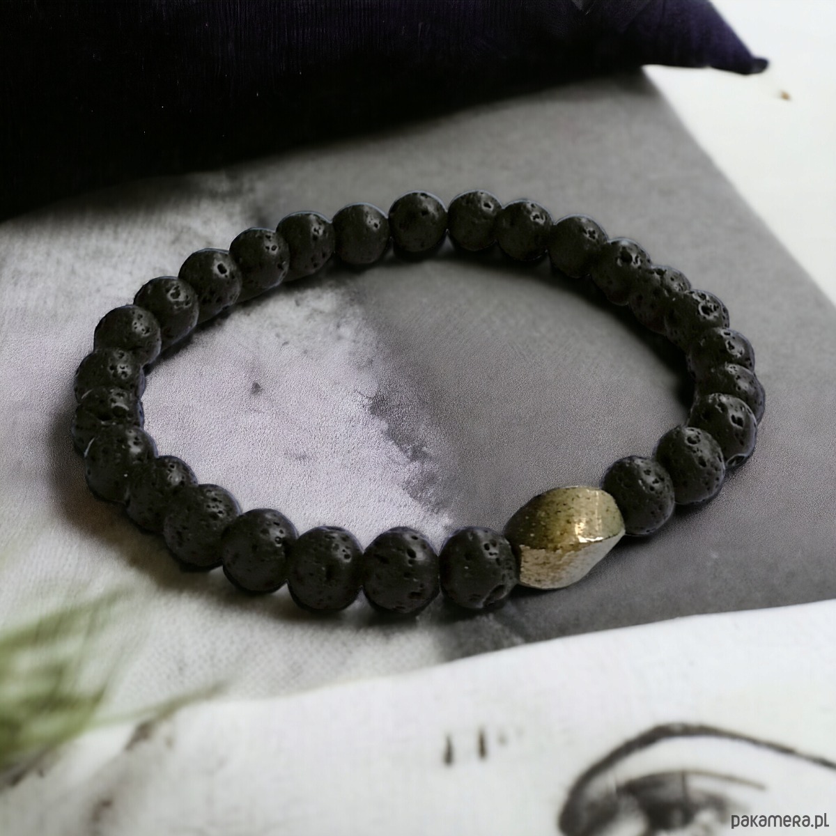 TUTAJ: prosta, lecz ciekawa bransoletka wykonana z kul porowatej lawy wulkanicznej 6mm, z elementem twist z pirytu(ok. 10mm)