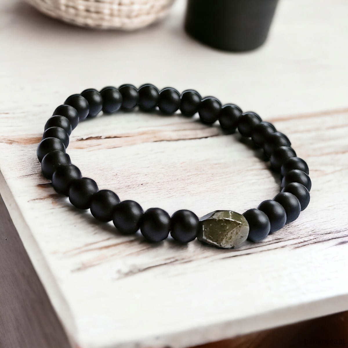 TUTAJ: prosta, lecz ciekawa bransoletka wykonana z kul matowego onyksu 6mm, z elementem twist z pirytu(ok. 10mm)