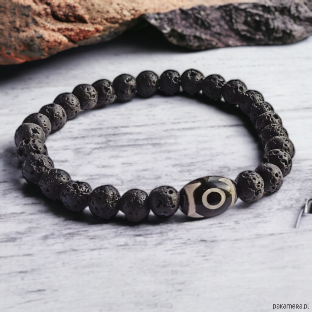 delikatna niezwykle ciekawa bransoletka- talizman wykonana z porowatej lawy wulkanicznej (kuleczki 6mm) oraz elementu z AGATU TYBETAŃSKIEGO (czerń + beż)