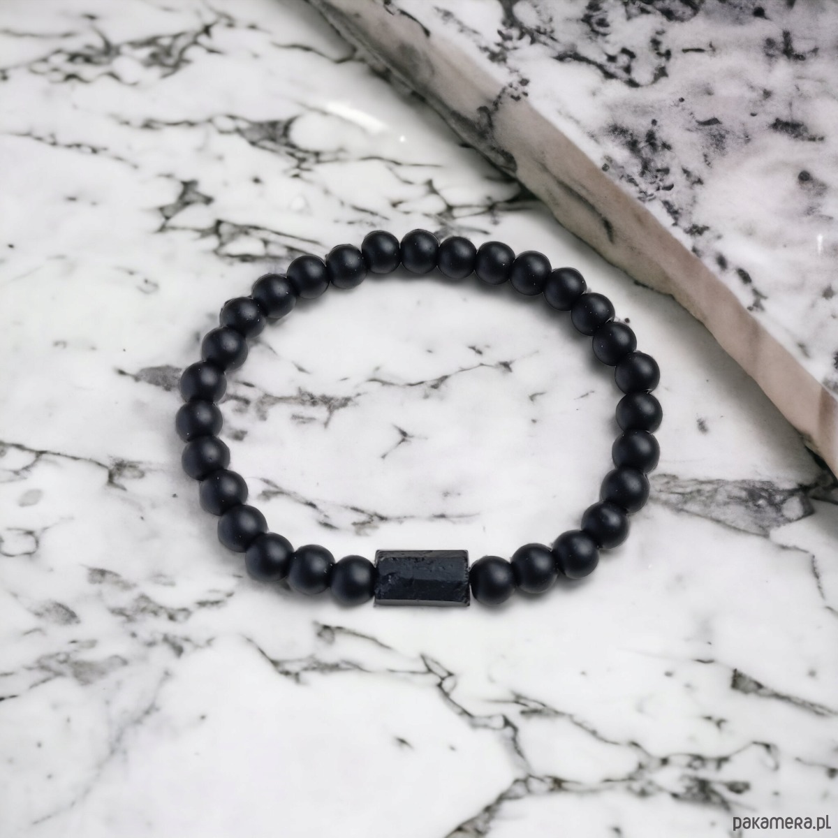 delikatna, niezwykle ciekawa bransoletka- talizman wykonana z kuleczek matowego onyksu (6mm) oraz surowej bryłki czarnego turmalinu.