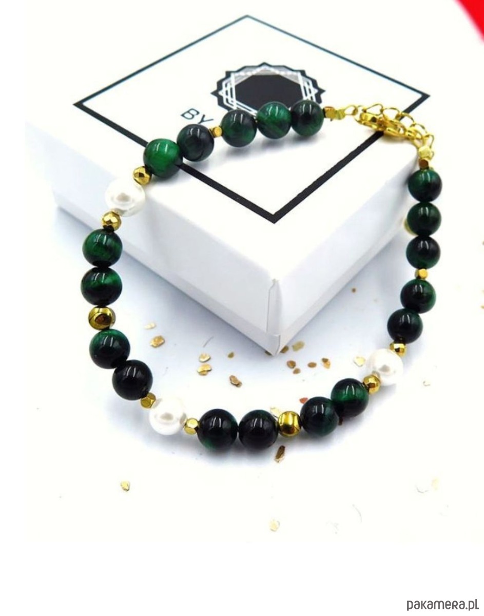 Luksusowa bransoletka wykonana z ręcznie szlifowanych, szmaragdowych kamieni tygrysiego oka, eleganckich pereł Majorka oraz błyszczących, złotych hematytów.