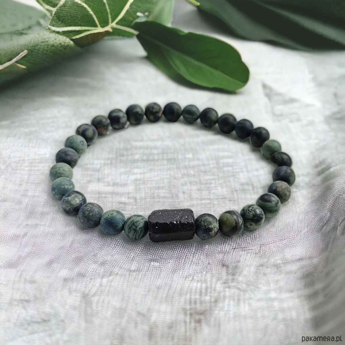 delikatna niezwykle ciekawa bransoletka- talizman wykonana z kuleczek matowego ciemno-zielonego jaspisu kambaba (6mm) i surowej bryłki czarnego turmalinu.na solidnej gumce jubilerskiej. bez elementów metalowych.