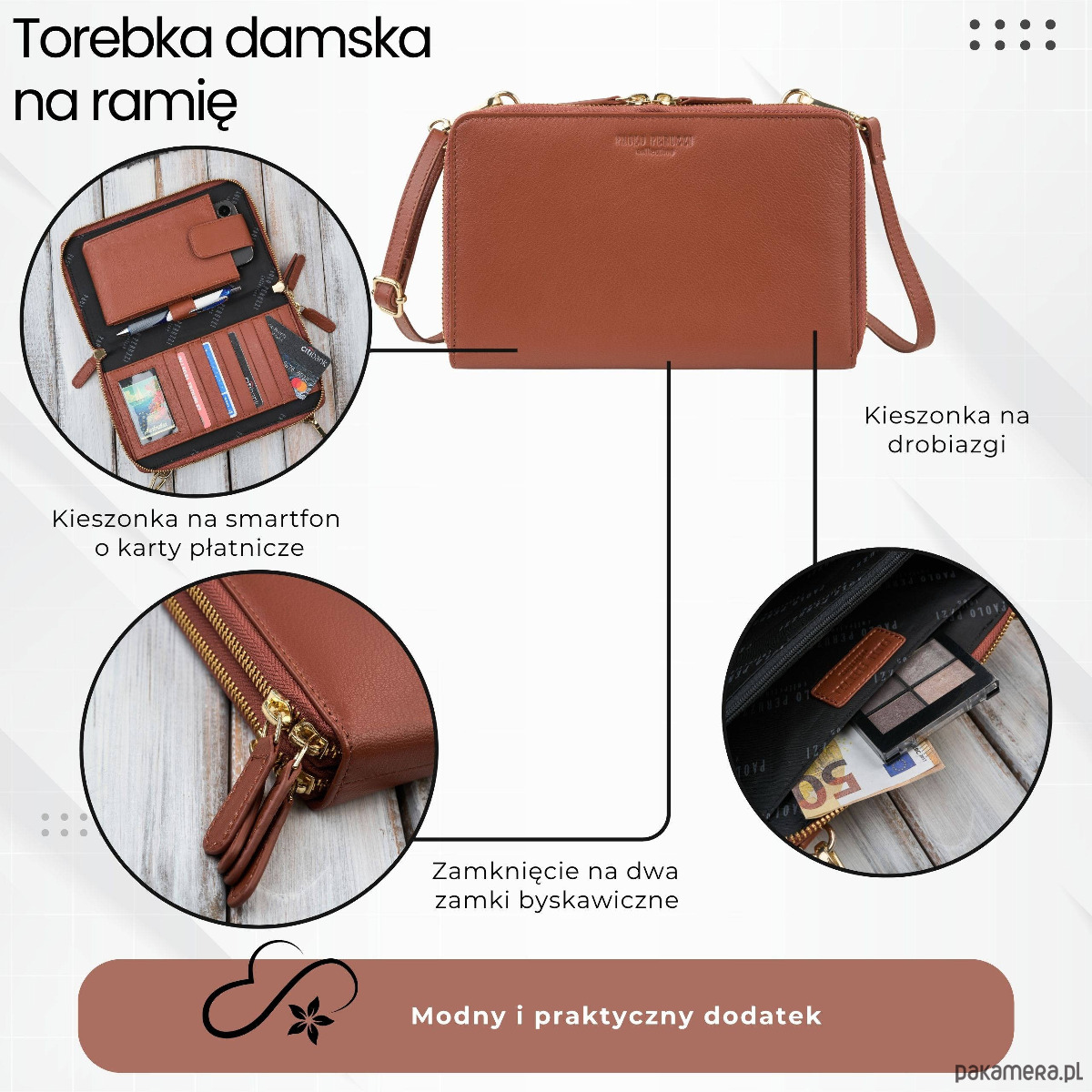 Damska mała torebka skórzana kopertówka na ramię do ręki koniakowa Paolo Peruzzi KV-02-CG