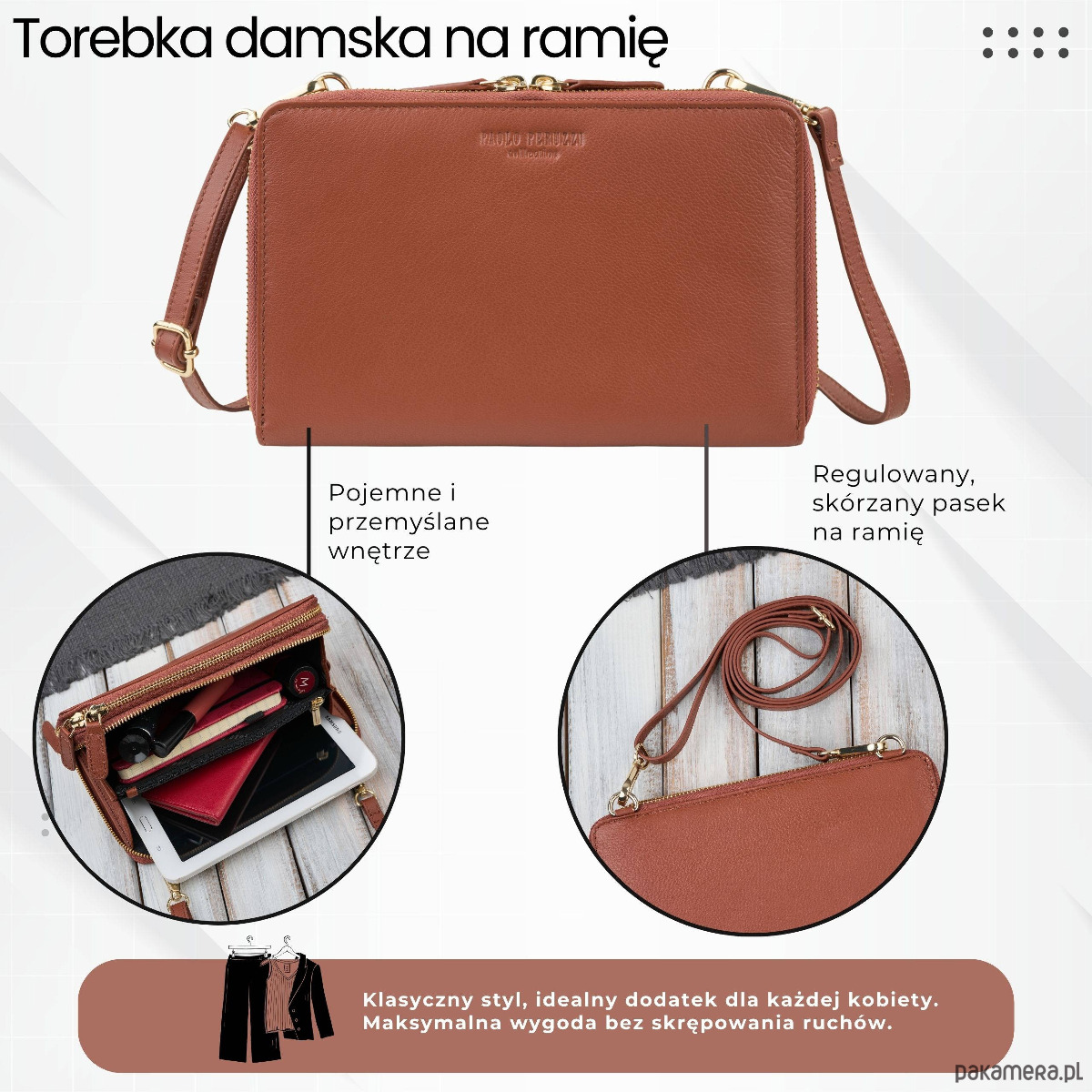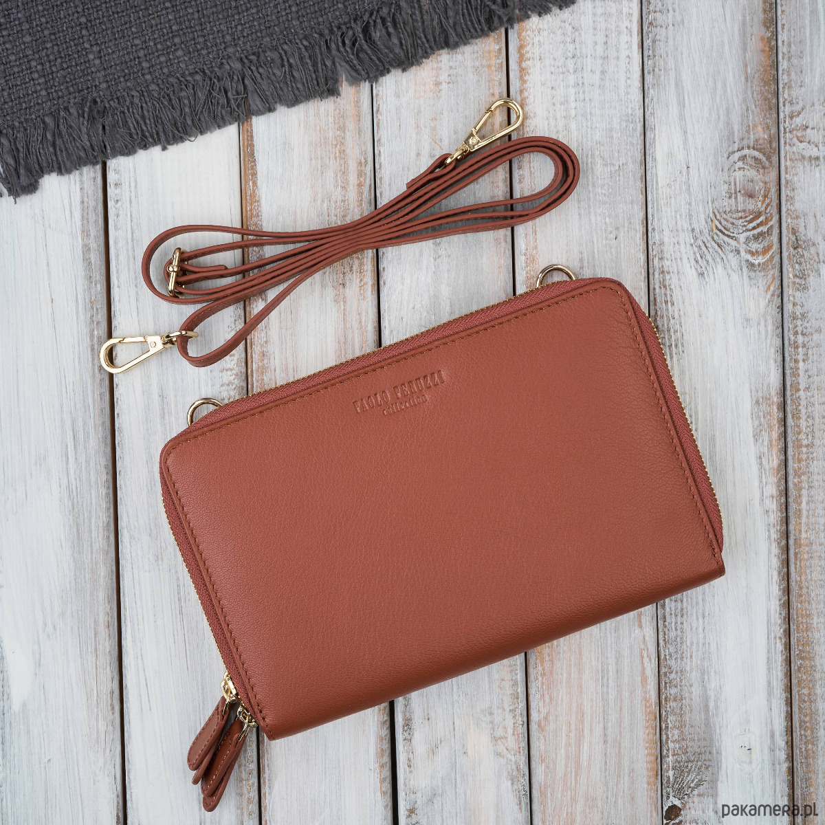Damska mała torebka skórzana kopertówka na ramię do ręki koniakowa