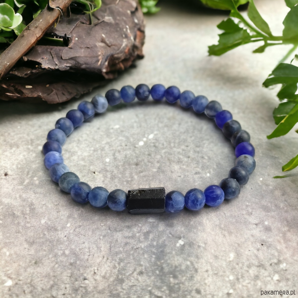 delikatna niezwykle ciekawa bransoletka- talizman wykonana z kuleczek matowego sodalitu (6mm) i surowej bryłki czarnego turmalinu.na solidnej gumce jubilerskiej. bez elementów metalowych.