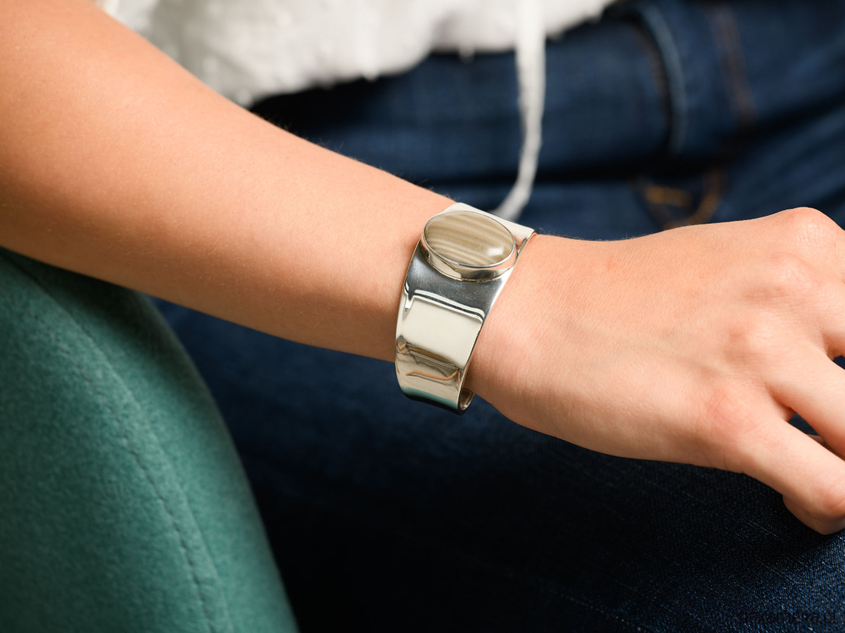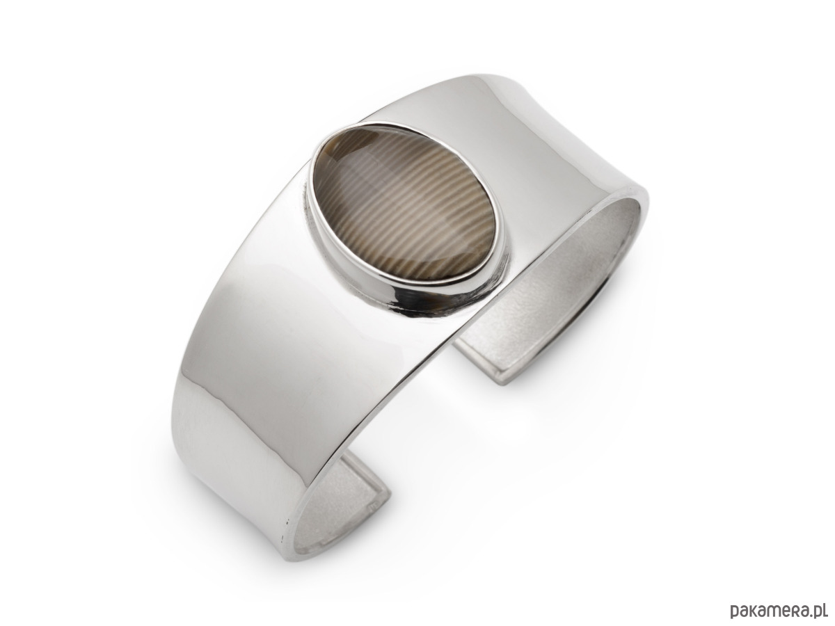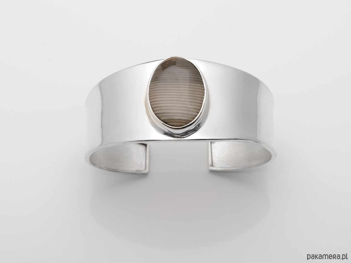 Okazała bransoleta wykonana ze srebra próby 925 z krzemieniem pasiastym - kamieniem optymizmu, występującym jedynie w Polsce kamieniem szlachetnym, zwanym także "polskim diamentem".