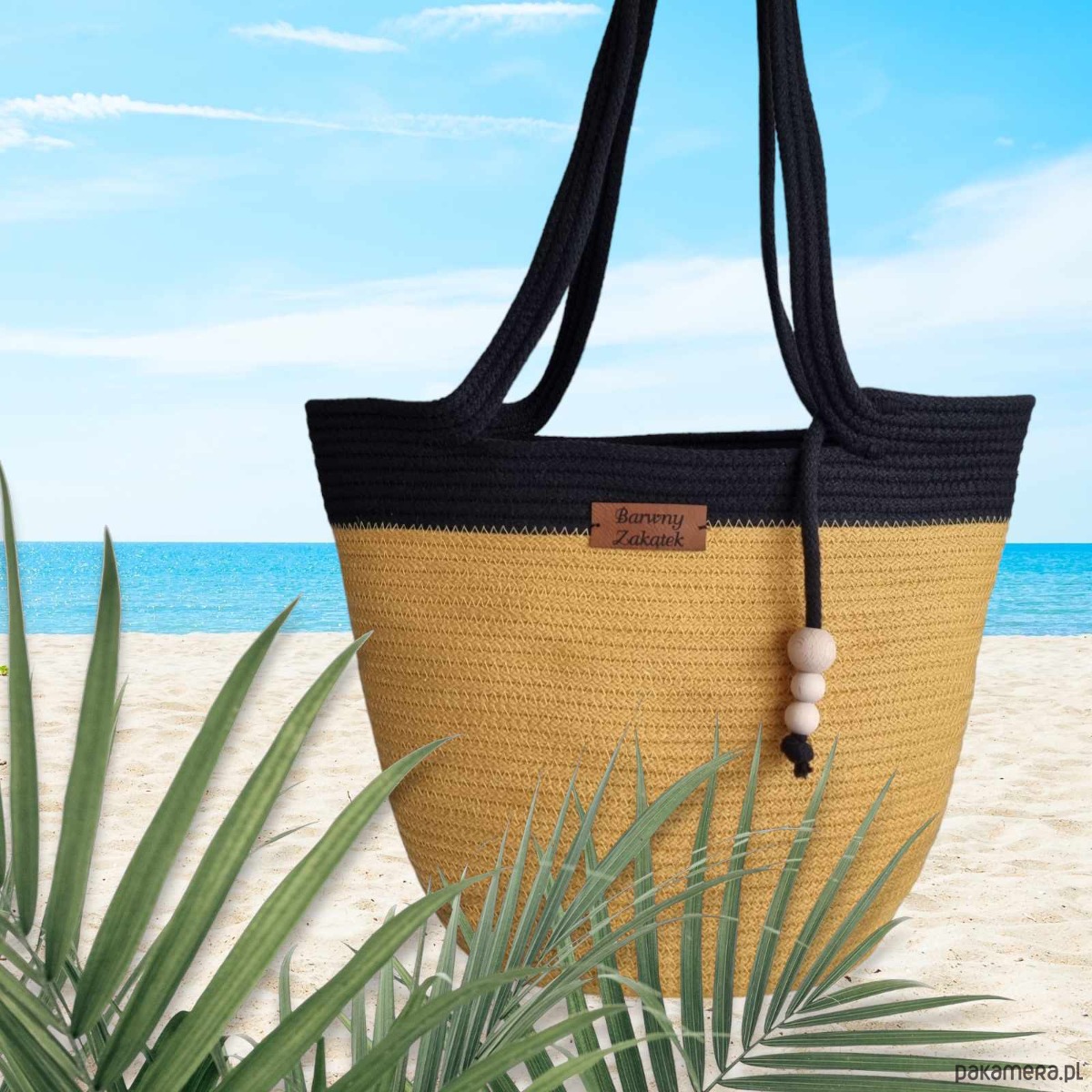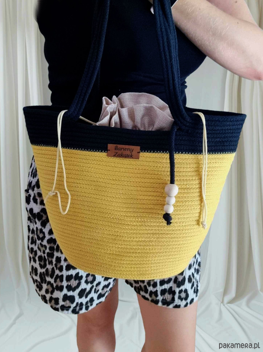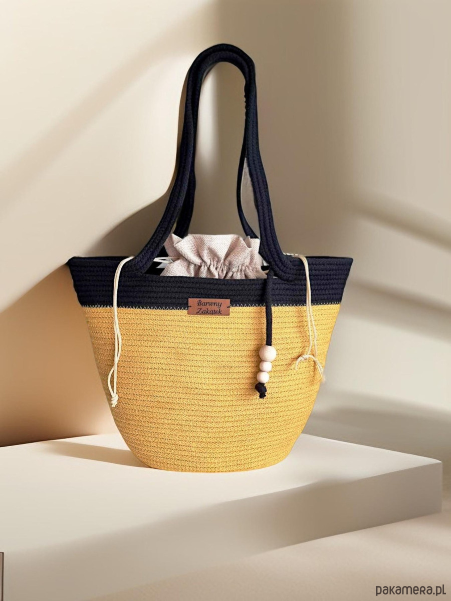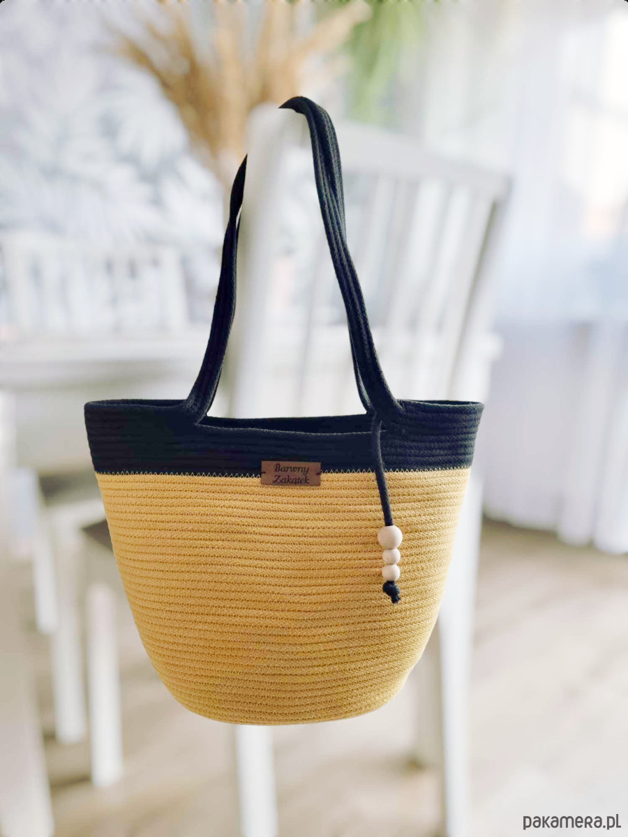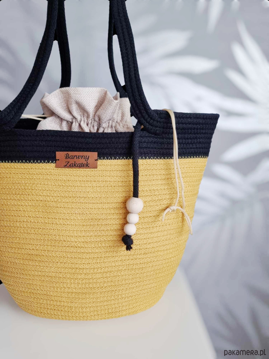 Damska torebka koszyk na lato ze sznurka bawełnianego w kolorze musztardowo-czarnym z ozdobnymi drewnianymi koralikami. Lekka, wygodna, z wyjmowanym workiem ze ściągaczem. Idealna na plażę, spacer i letnie wyjścia. Dodaj uroku swoim letnim stylizacjom!