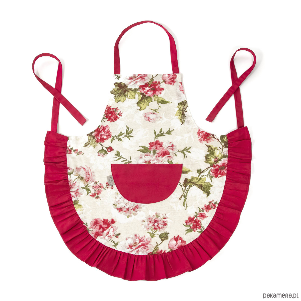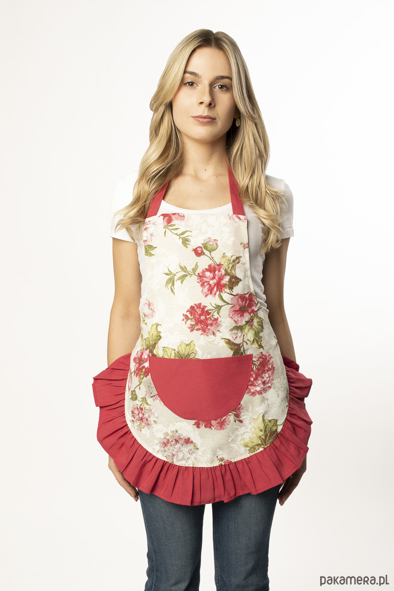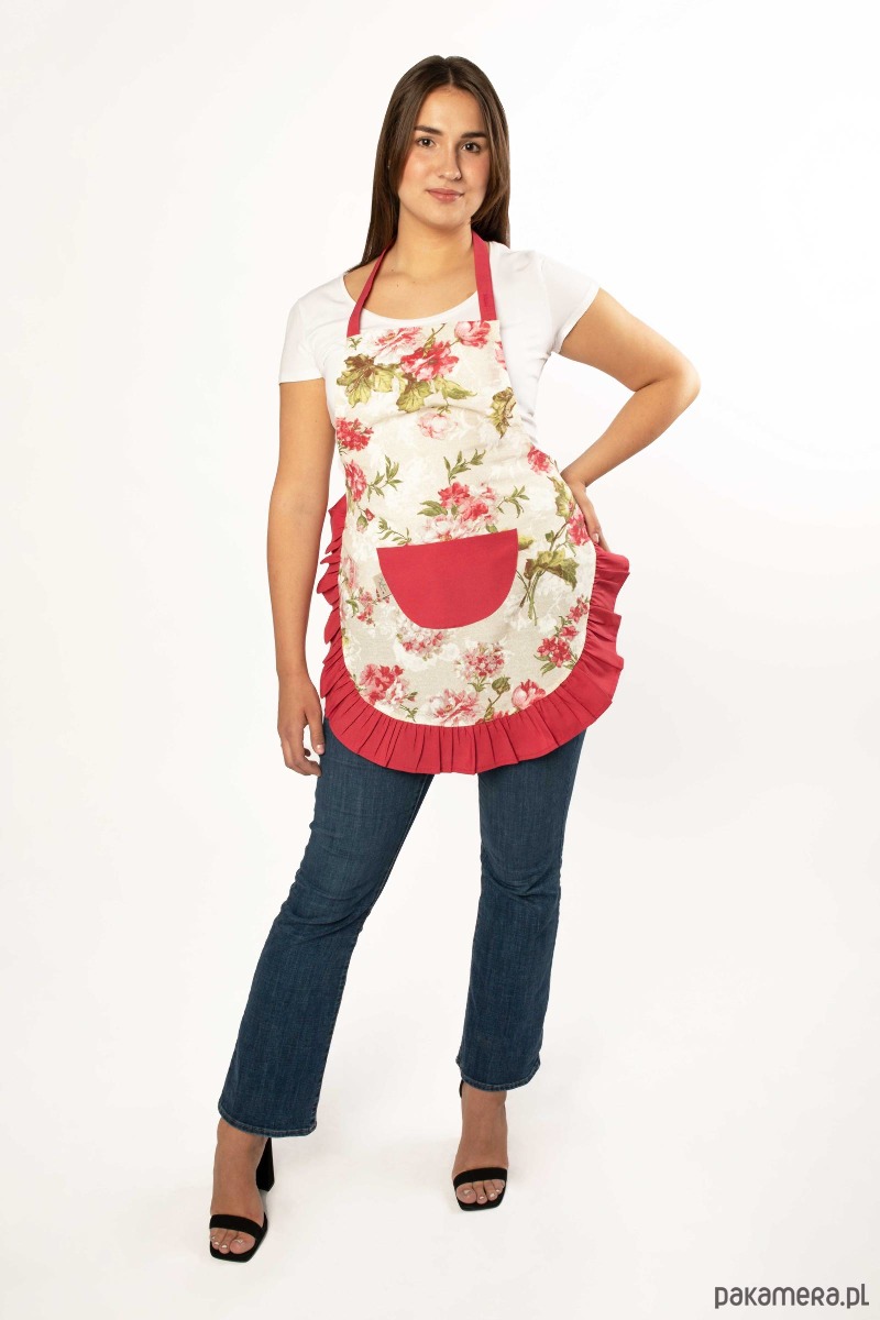 Klasycznie piękny radośnie kwiatowy fartuch kuchenny z fantazyjną falbaną, który zachwyca od pierwszego wejrzenia. Fartuch ma ponadczasowy kobiecy krój, w którym każda kobieta bez względu na typ sylwetki będzie się dobrze czuć i wspaniale prezentować.