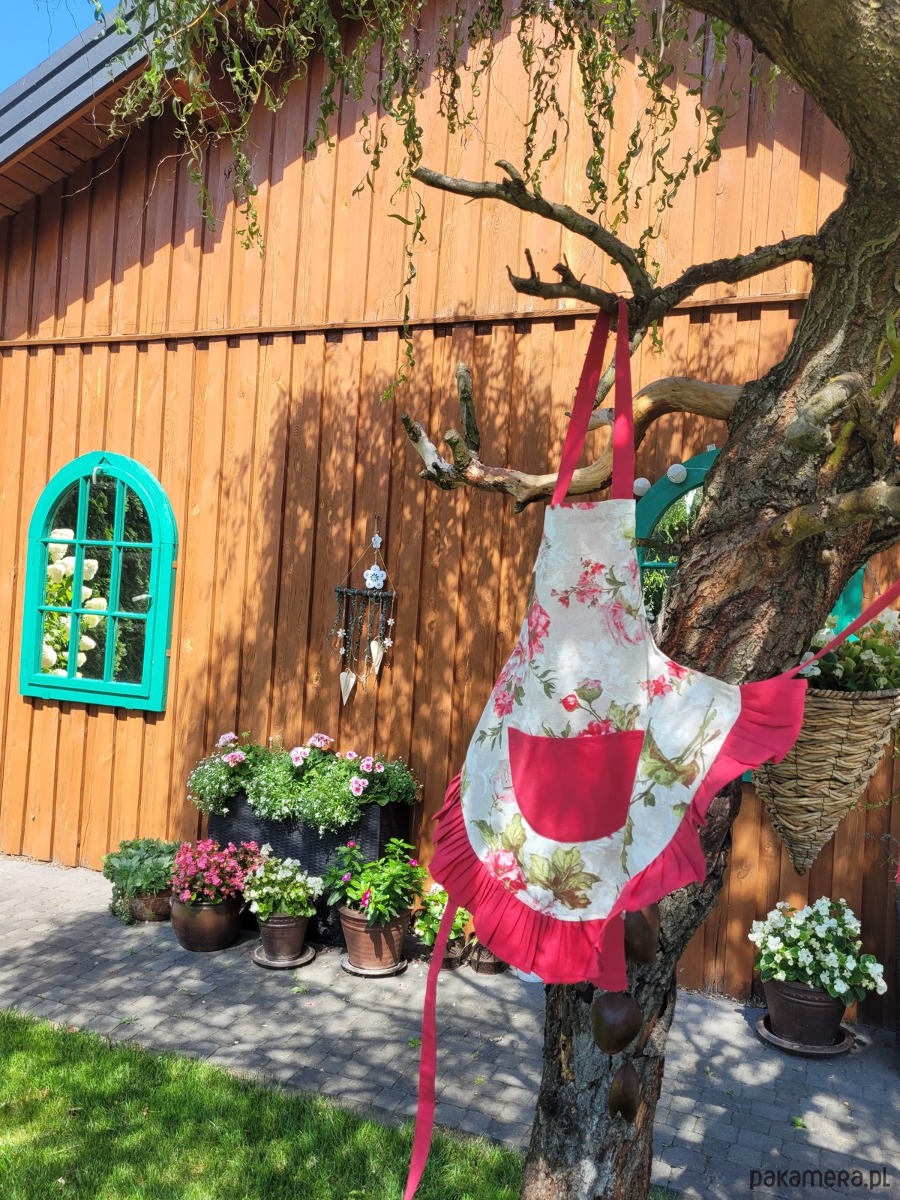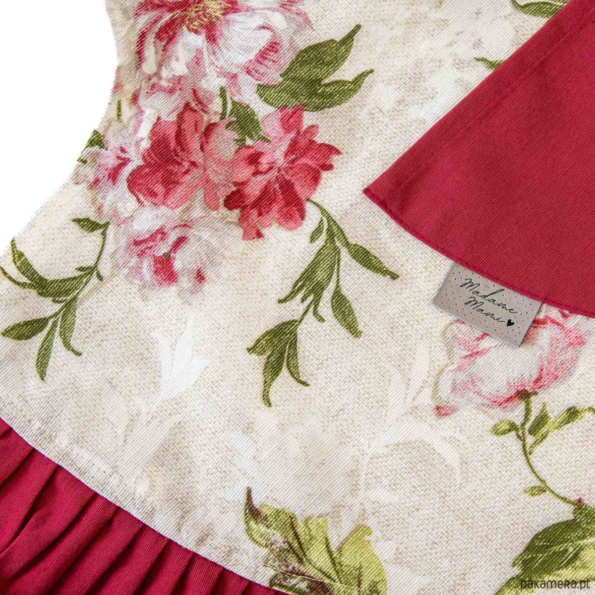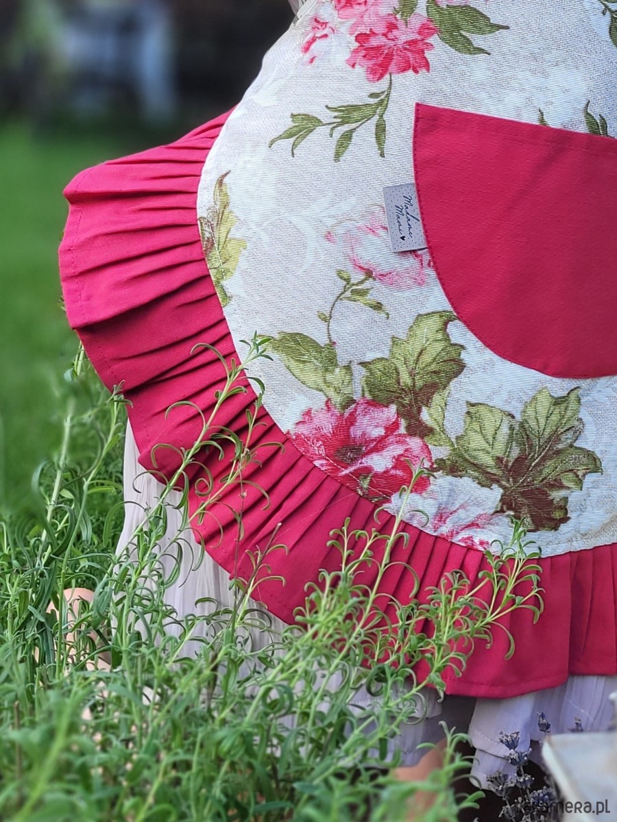 Klasycznie piękny radośnie kwiatowy fartuch kuchenny z fantazyjną falbaną, który zachwyca od pierwszego wejrzenia. Fartuch ma ponadczasowy kobiecy krój, w którym każda kobieta bez względu na typ sylwetki będzie się dobrze czuć i wspaniale prezentować.