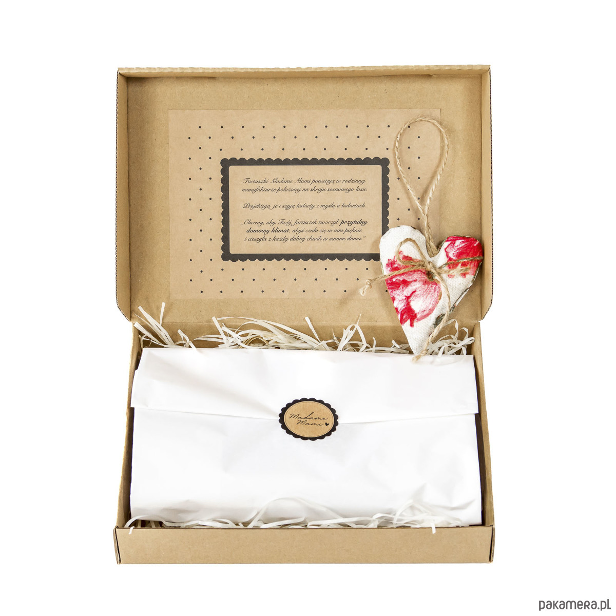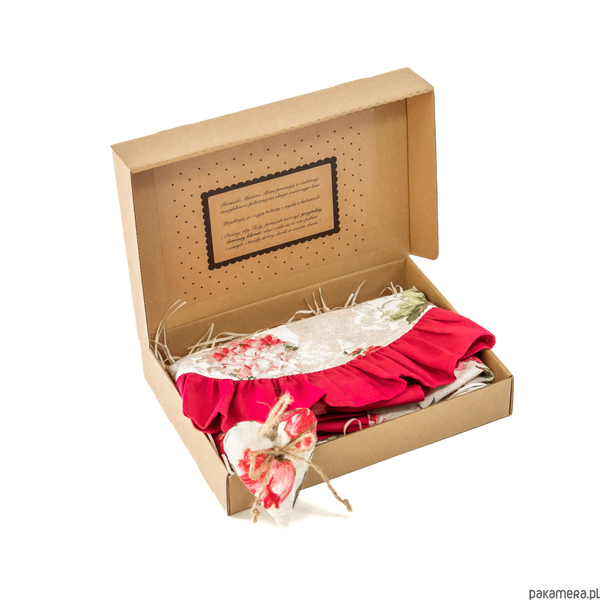 W pudełku znajduje się również urocza zawieszka w kształcie serca i to ją w pierwszej kolejności zobaczy obdarowana kobieta! Serduszko jest wykonane z tej samej tkaniny, co fartuch, co przekłada się na spójny i elegancki wizerunek podarunku.