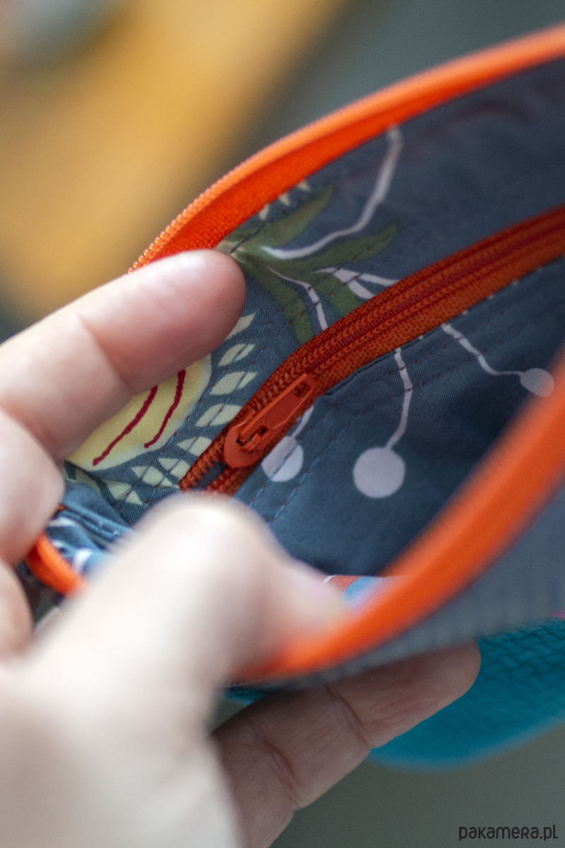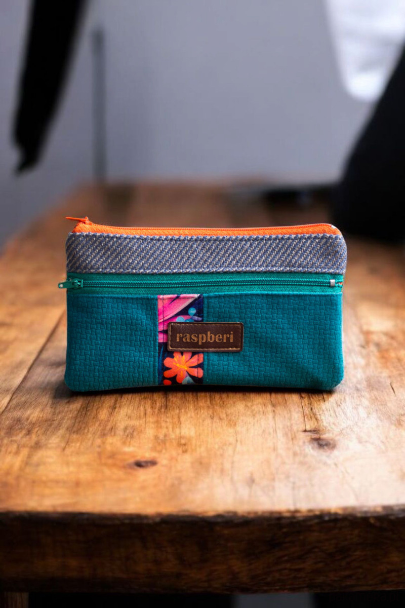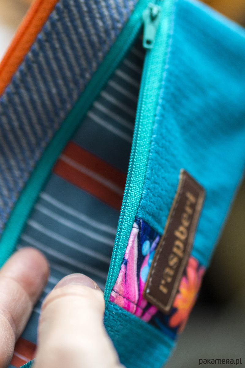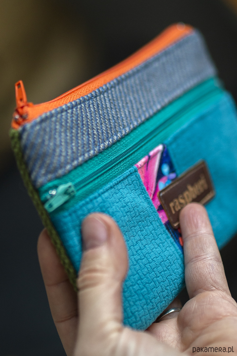Prosty wodoodporny portfel wykonany z kilku rodzajów kolorowych tkanin.