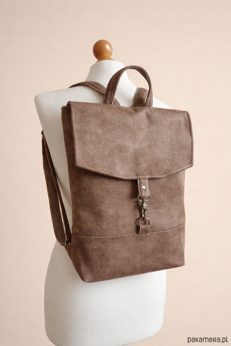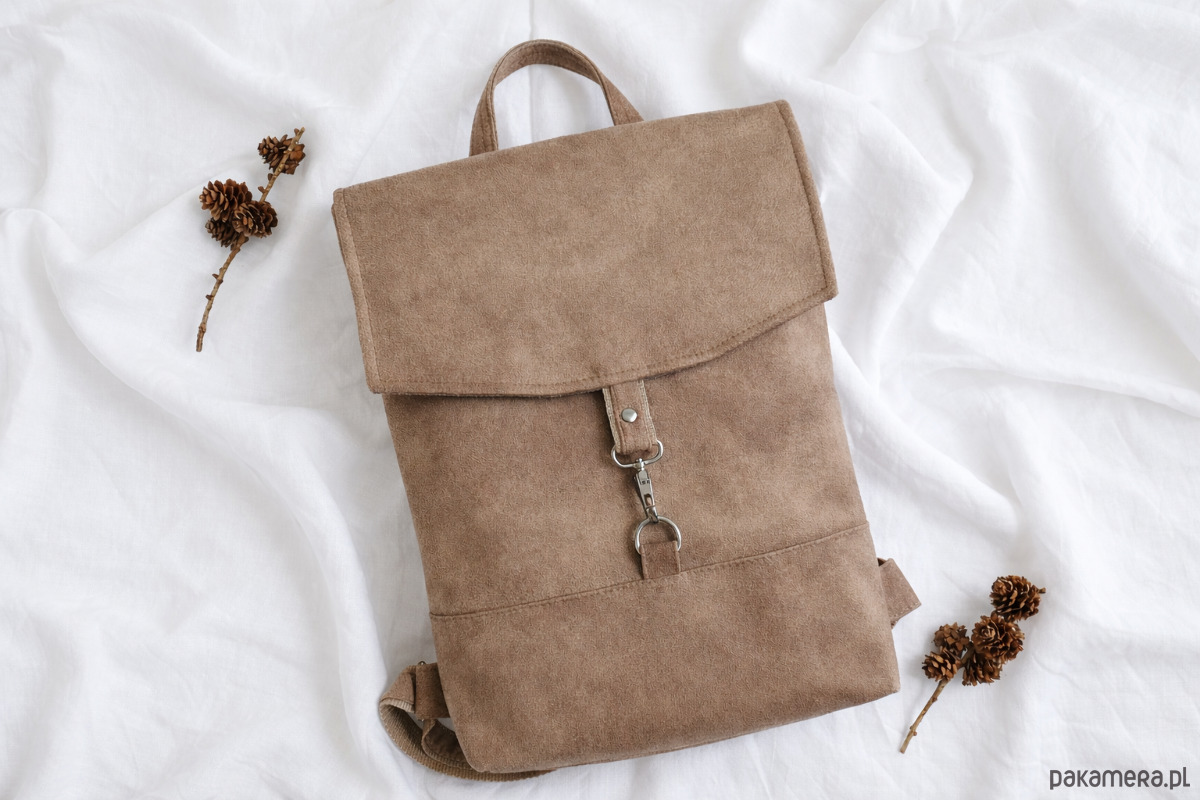 Plecak uszyty z mocnego weluru tapicerskiego w beżowym kolorze. Zapięcie na karabińczyk w kolorze niklu.