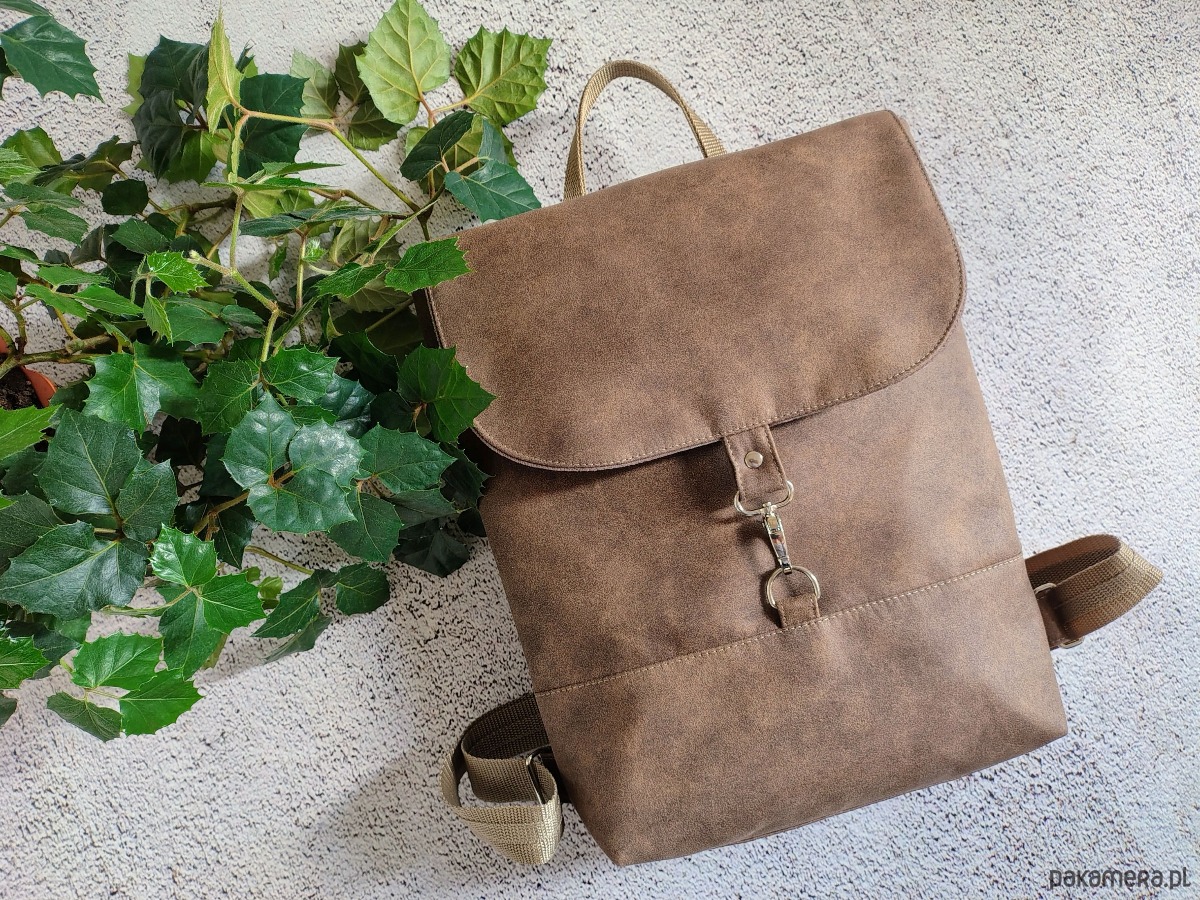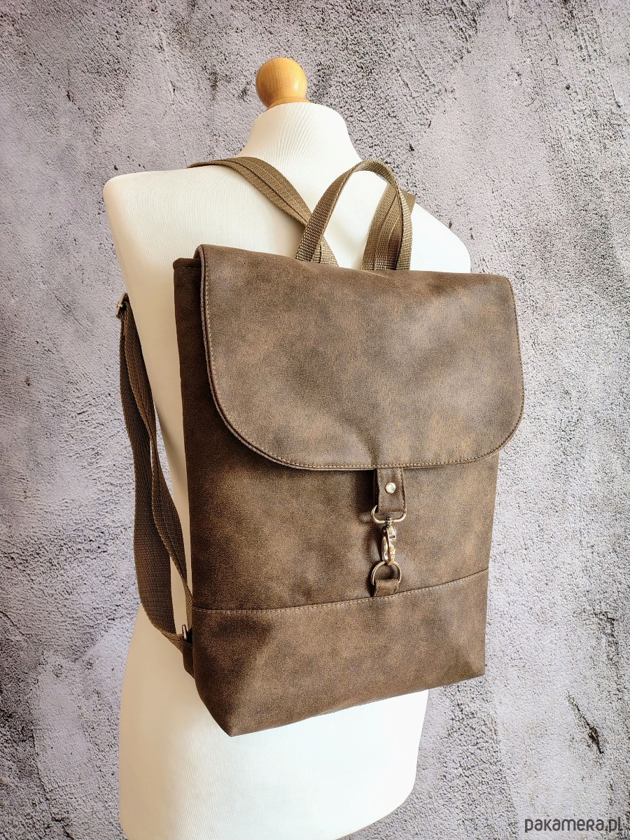 Plecak uszyty z mocnej i grubej tkaniny tapicerskiej o fakturze przecieranej skóry. Zapięcie na karabińczyk w kolorze niklu.