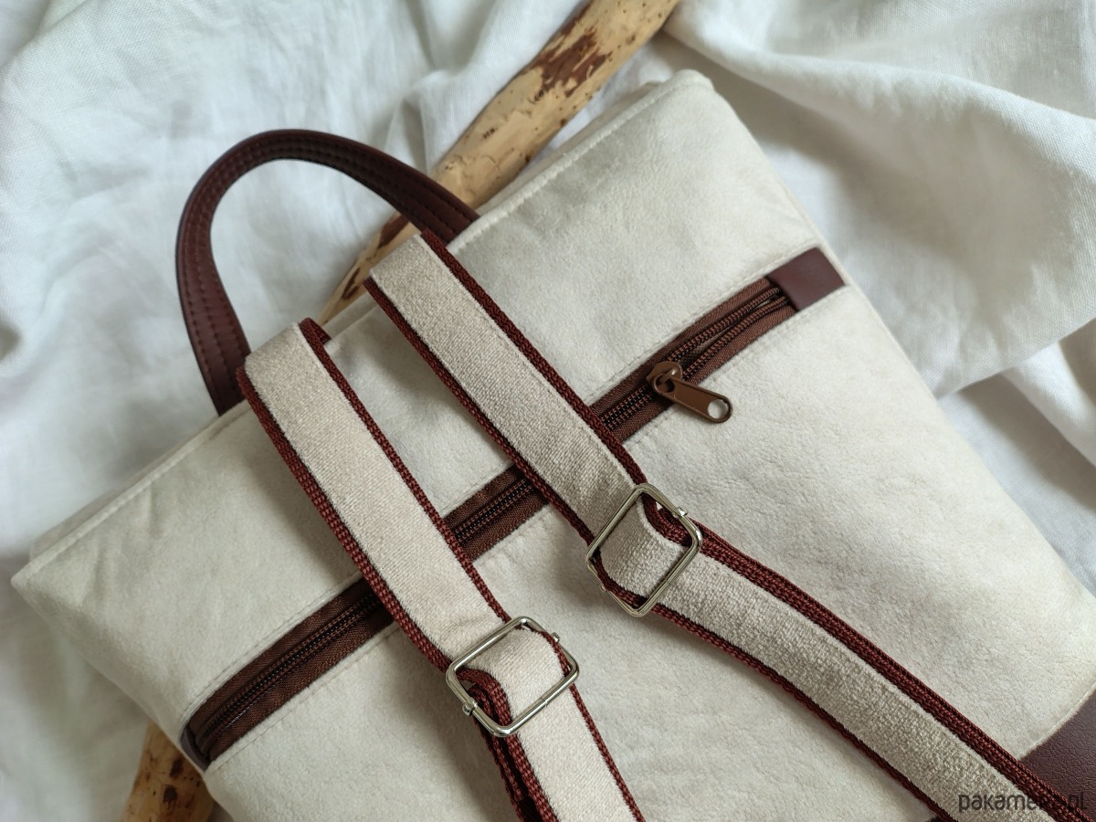 Plecak uszyty z mocnego weluru tapicerskiego w połączeniu ze sztuczną skórą. Akcesoria w kolorze niklu. Swobodnie mieści A4.