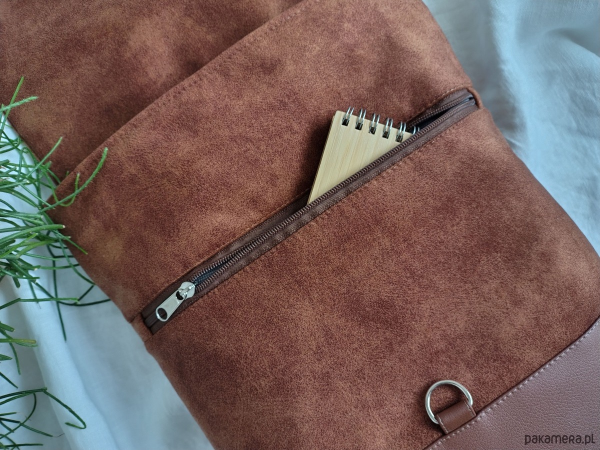 Plecak uszyty z mocnego weluru tapicerskiego w cynamonowym kolorze w połączeniu ze sztuczną skórą. Zapięcie na karabińczyk w kolorze niklu.