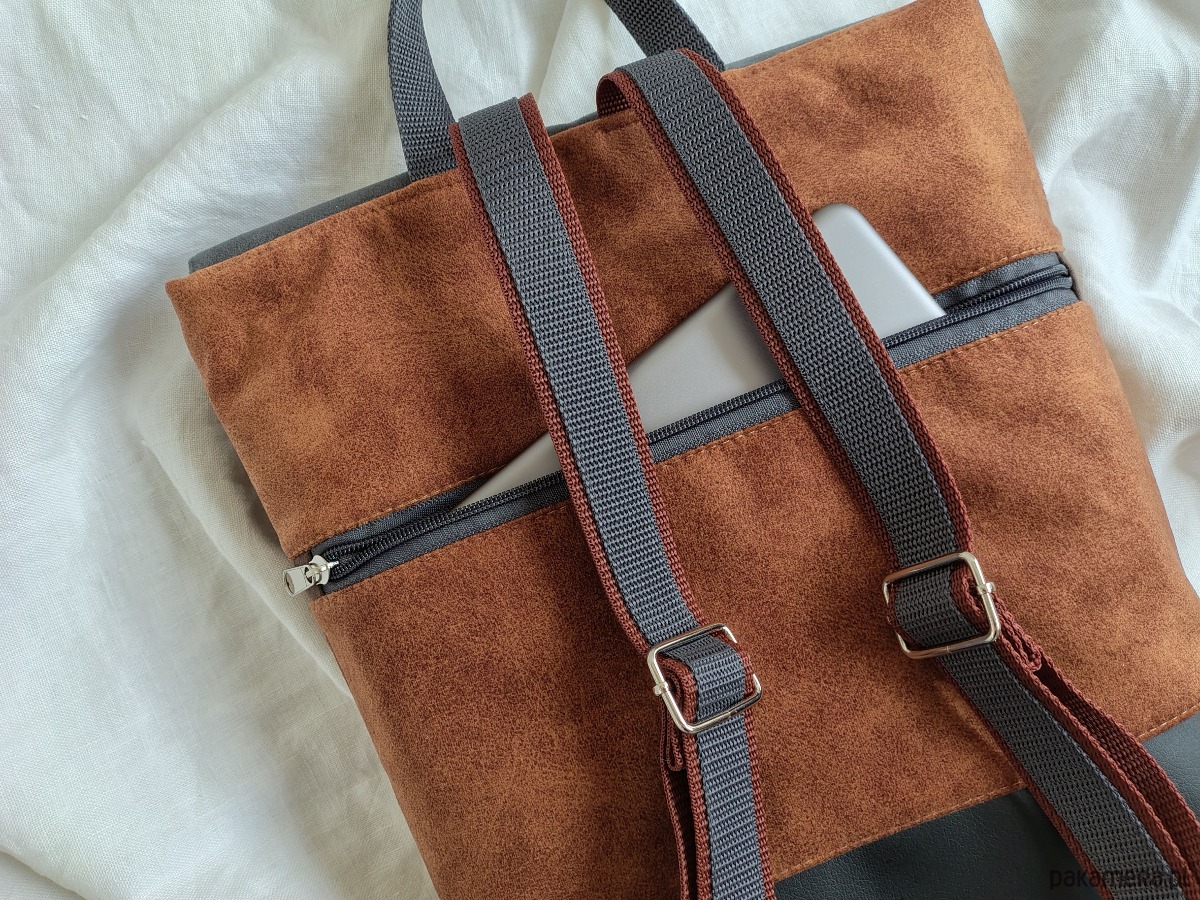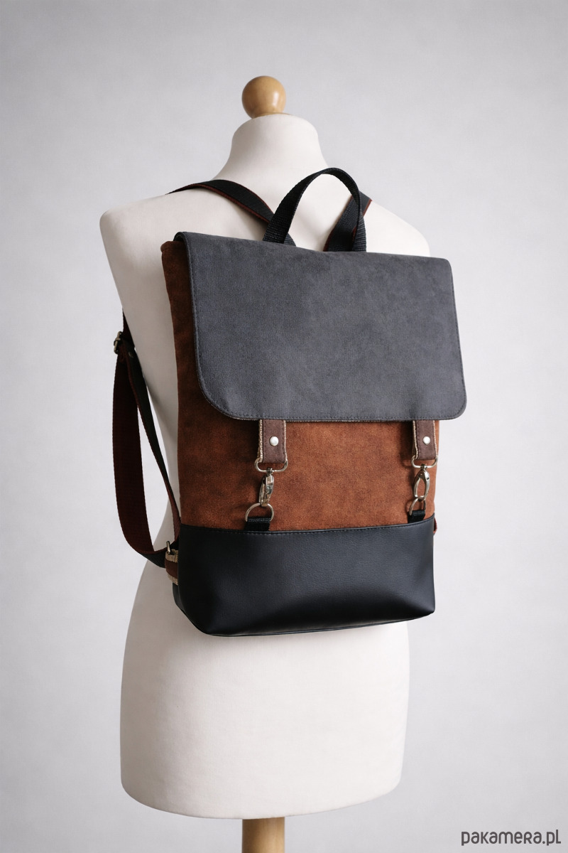 Plecak uszyty z mocnego weluru tapicerskiego w cynamonowym kolorze w połączeniu ze sztuczną skórą. Zapięcie na karabińczyk w kolorze niklu.