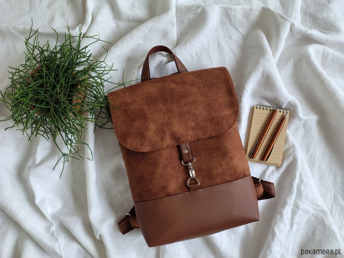 Plecak uszyty z mocnego weluru tapicerskiego w cynamonowym kolorze w połączeniu ze sztuczną skórą. Zapięcie na karabińczyk w kolorze niklu.