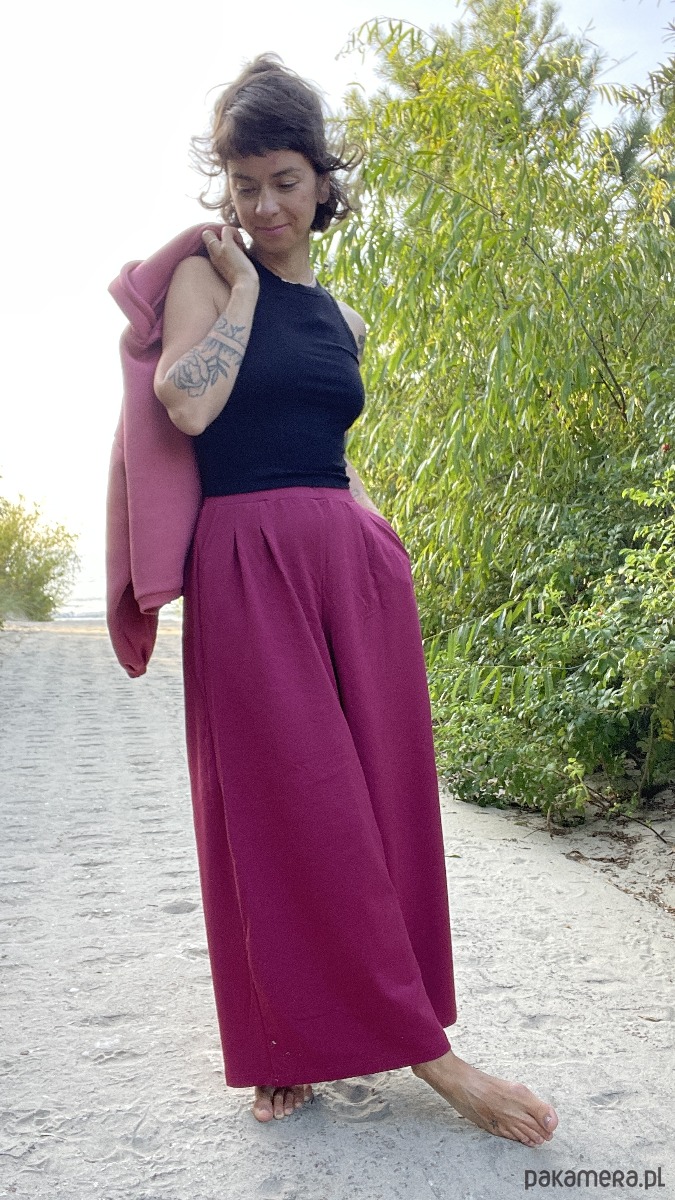 Nasze materiałowe spodnie wyróżnia szereg dopracowanych detali. Efektowne zaszewki w talii nadają im kobiecego uroku i wizualnie modelują sylwetkę. Szeroka guma w pasie miękko dopasowuje się do ciała i pozwala swobodnie odetchnąć, a dwie praktyczne kieszenie pomieszczą wszelkie drobiazgi, które chcesz mieć pod ręką.