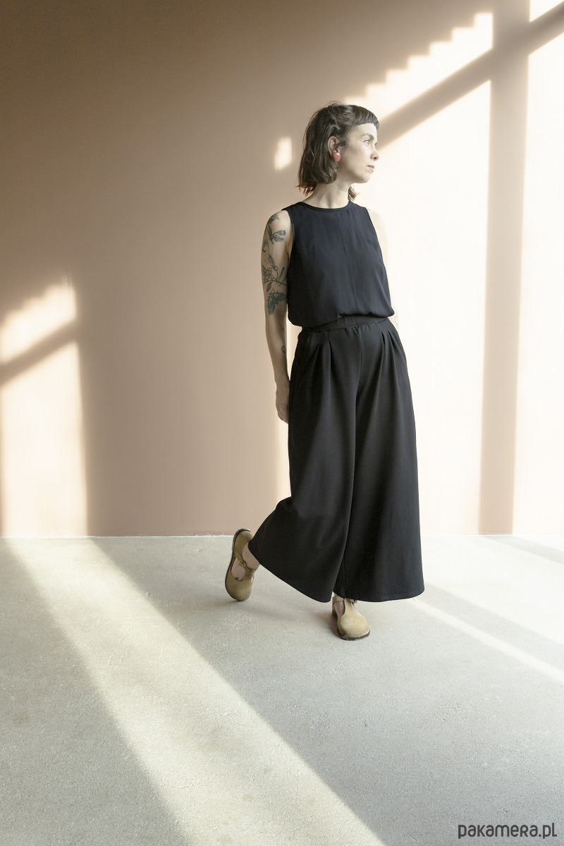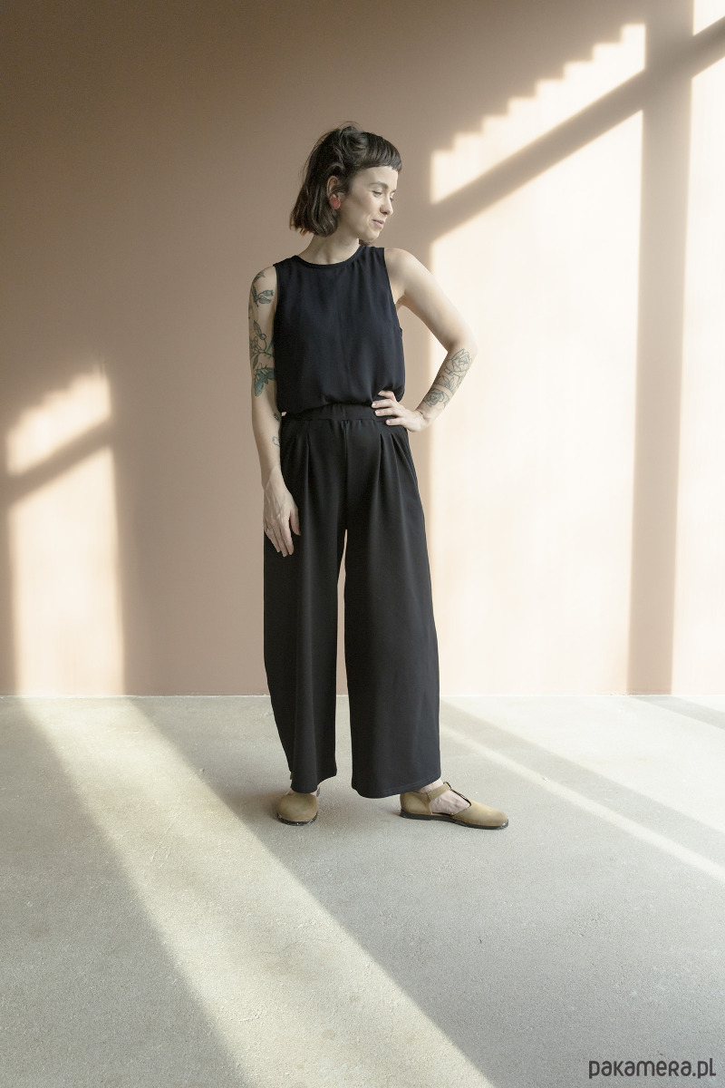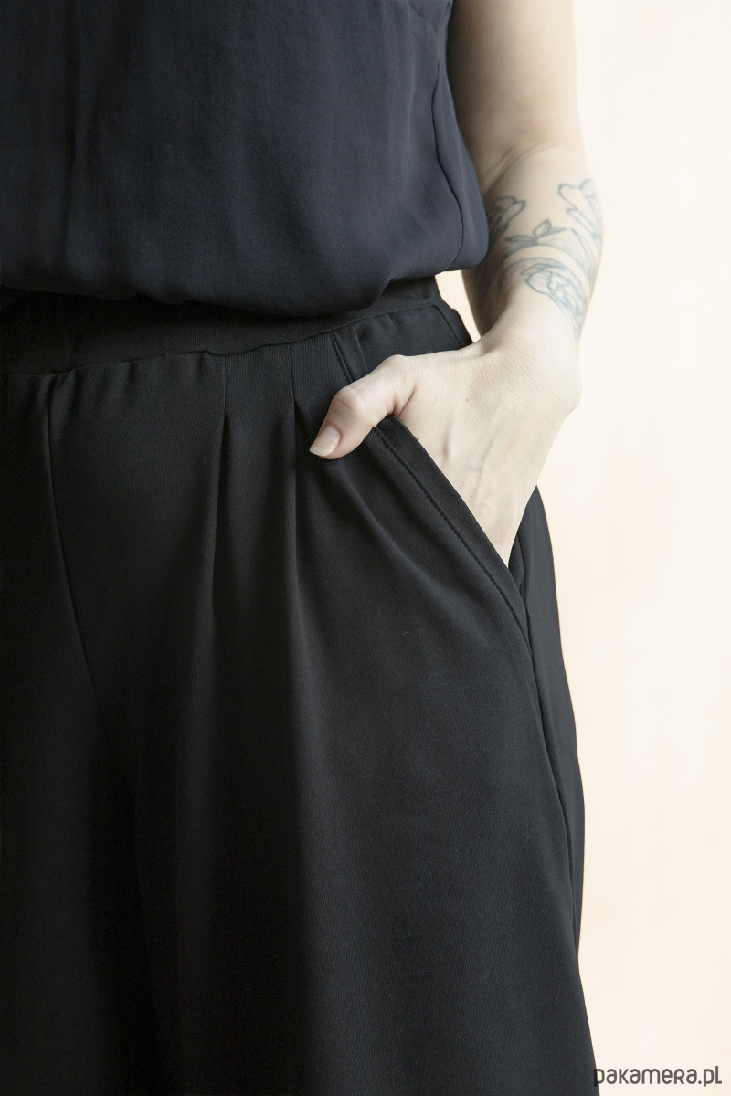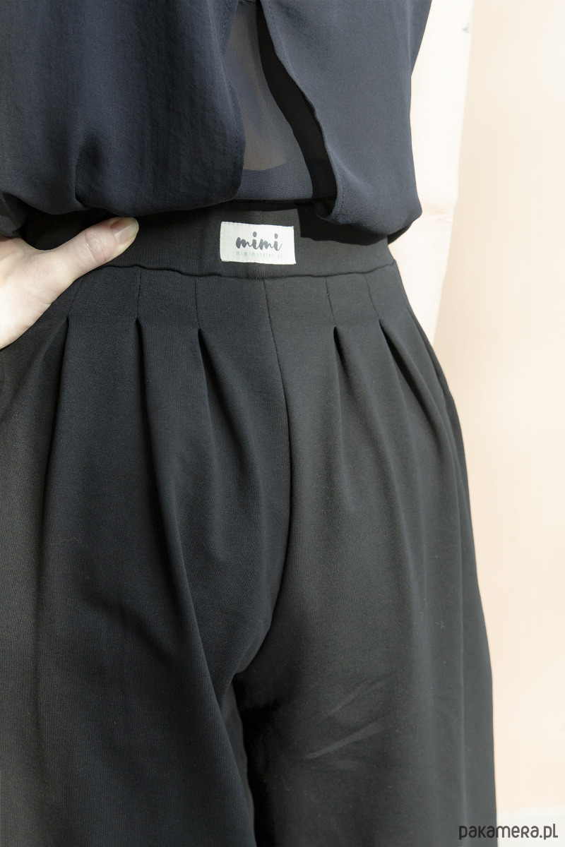 Nasze materiałowe spodnie wyróżnia szereg dopracowanych detali. Efektowne zaszewki w talii nadają im kobiecego uroku i wizualnie modelują sylwetkę. Szeroka guma w pasie miękko dopasowuje się do ciała i pozwala swobodnie odetchnąć, a dwie praktyczne kieszenie pomieszczą wszelkie drobiazgi, które chcesz mieć pod ręką.