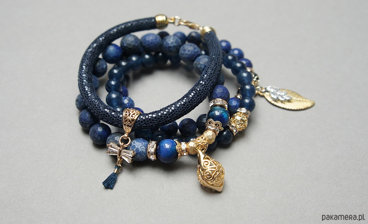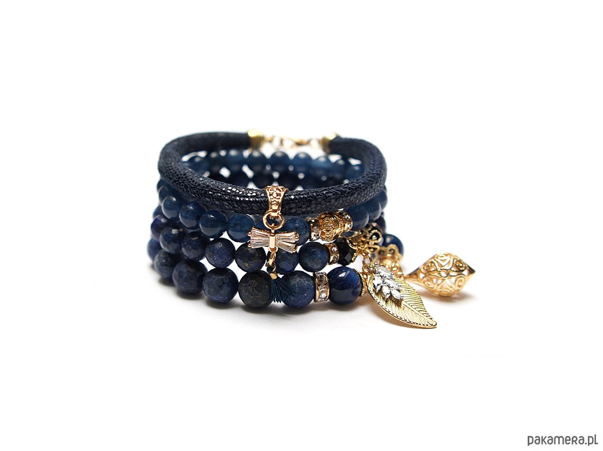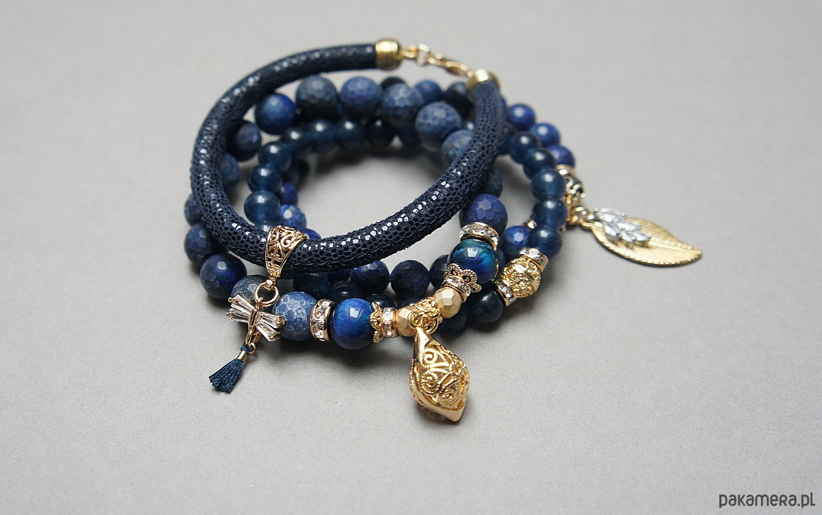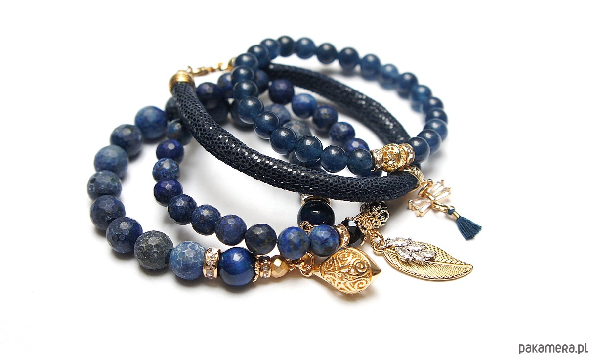 Komplet czterech bransoletek wykonanych z naturalnych kamieni - tygrysie oko [10mm], jaspis [10mm], jaspis fasetowany [8mm i 10mm], jadeit [8mm], kryształków fasetowanych [8mm], hematyt platerowany [6mm], rzemienia z naturalnej skóry, chwostu, zawieszki oraz łącznika wysadzanych cyrkoniami oraz elementów metalowych w kolorze złotym. Bransoletki pasują na nadgarstek 16 - 17cm. Biżuteria ozdobnie zapakowana