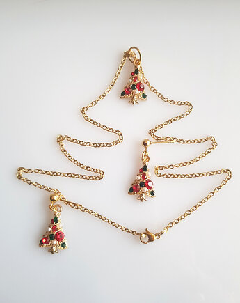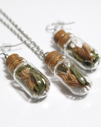 Złoty komplet biżuterii zielone prawdziwe kwiaty wisiorek kolczyki