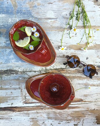 Zestaw dwóch bordowych filiżanek / kubków z talerzykami. polskie rękodzieło