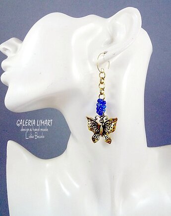 Złoty motyl z kobaltem urocze długie modne kolczyki w stylu boho handmade