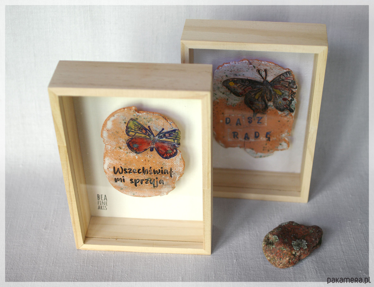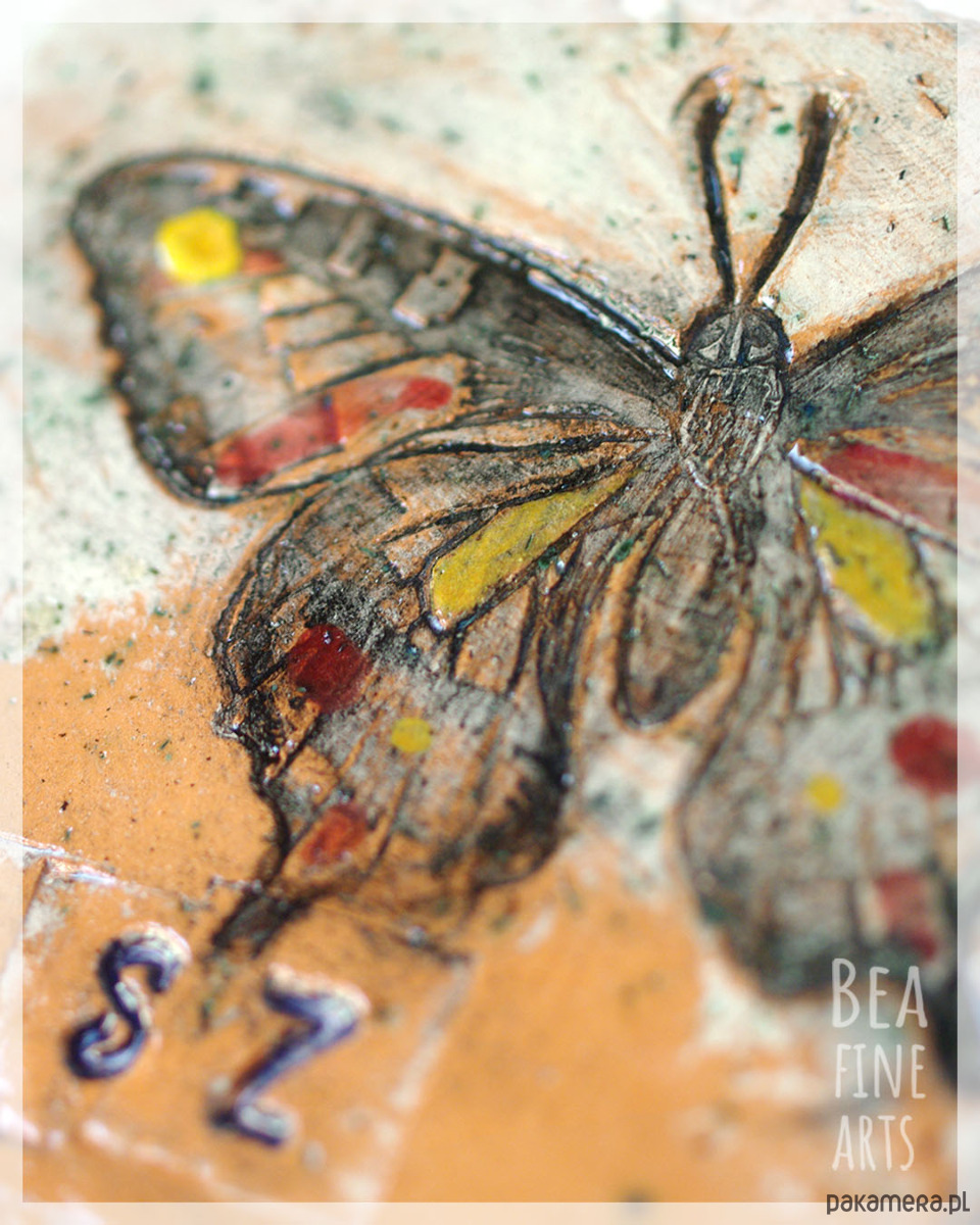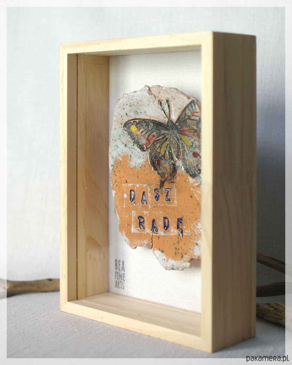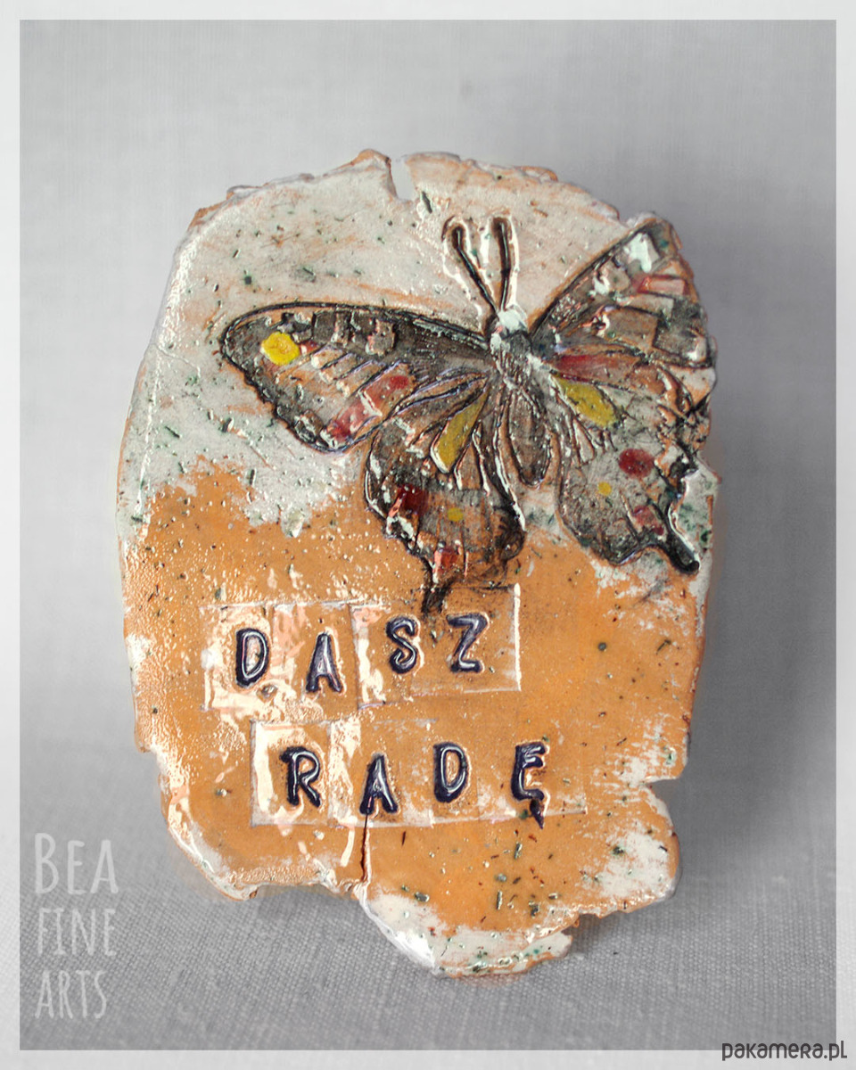 Efektowny dekor ceramiczny z motylem i napisem „Dasz radę”, o nieregularnym kształcie, z surowymi, niewygładzonymi krawędziami. Motyl symbolizuje przemianę i lekkość, a hasło dodaje siły i otuchy. Ceramika została ręcznie wykonana z łososiowej gliny z szamotem, precyzyjnie pomalowana wieloma warstwami farby podszkliwnej, a następnie poszkliwiona. Wypalona dwukrotnie w piecu w temperaturach 875 i 1150 ºC.
