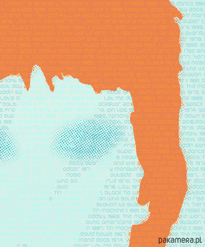 Plakat z autorską grafiką inspirowany Davidem Bowie i jego twórczością. Tło plakatu wypełnia chronologiczny zapis dyskografii artysty.
