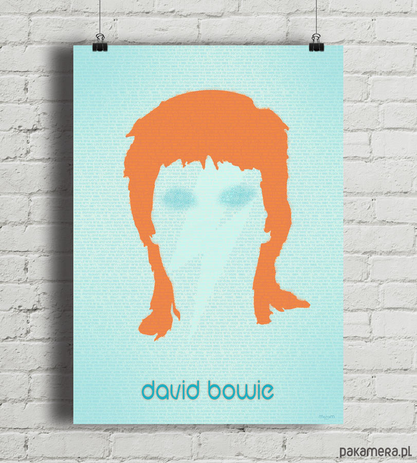 Plakat z autorską grafiką inspirowany Davidem Bowie i jego twórczością. Tło plakatu wypełnia chronologiczny zapis dyskografii artysty.