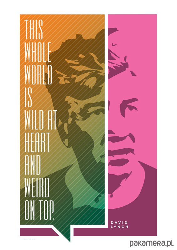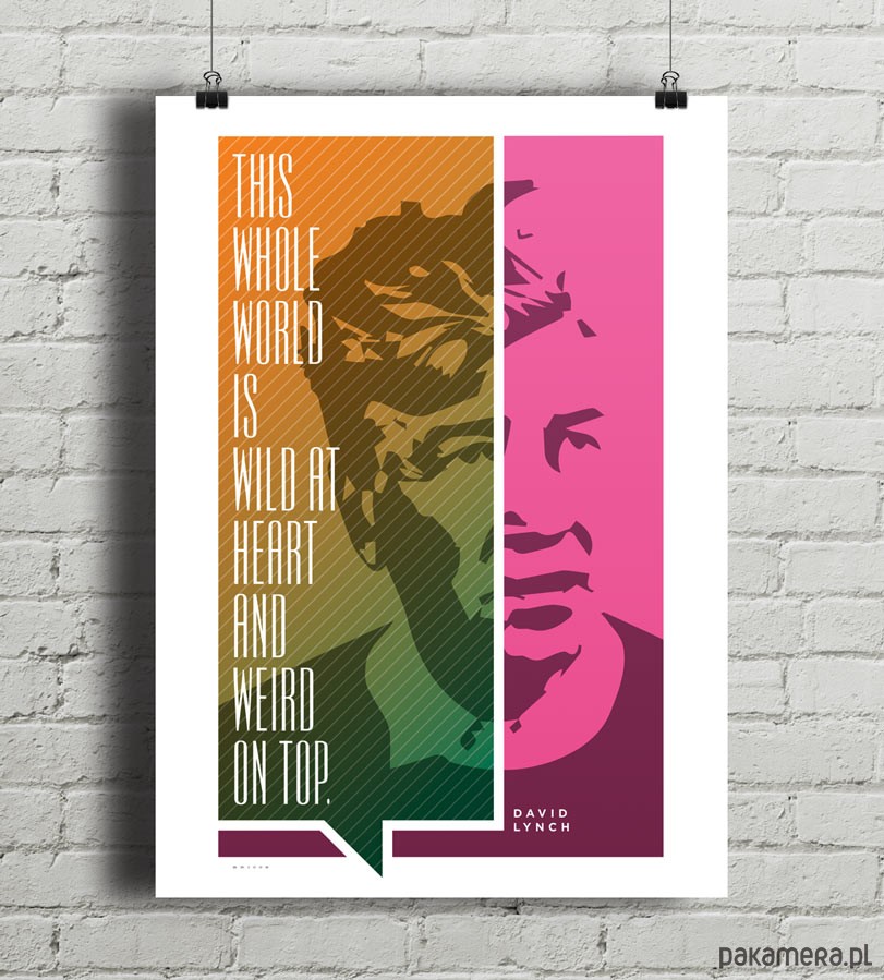 Plakat z autorską grafiką inspirowany postacią Davida Lyncha i jego wypowiedzią "The whole world is wild at heart and weird on top".