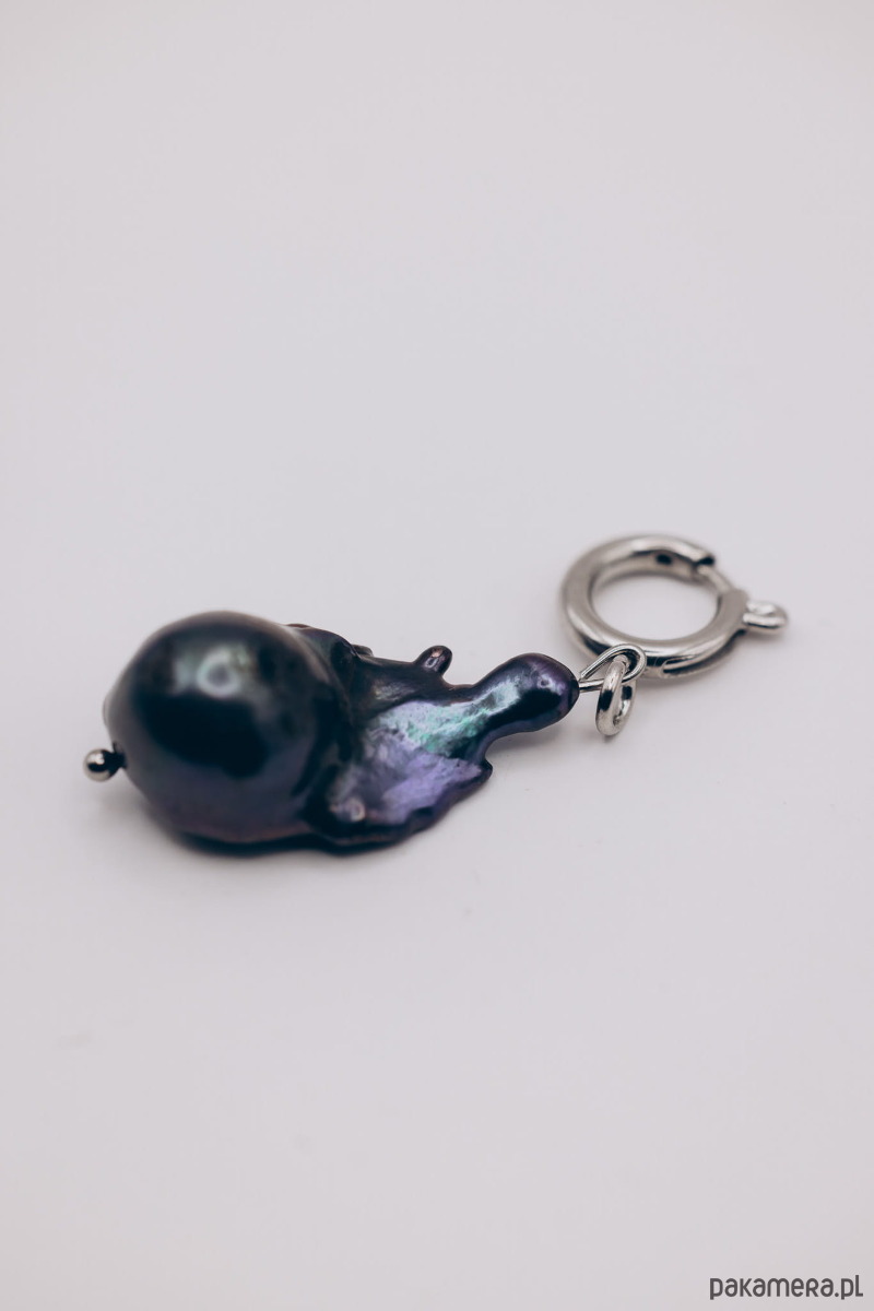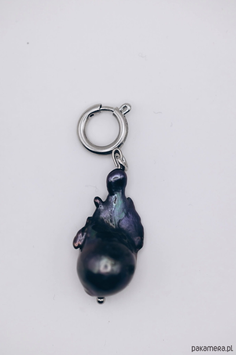 Ręcznie wykonana zawieszka charms z naturalną perłą baroque w kolorze czarnym, mieniącą sie odbiciami światła.