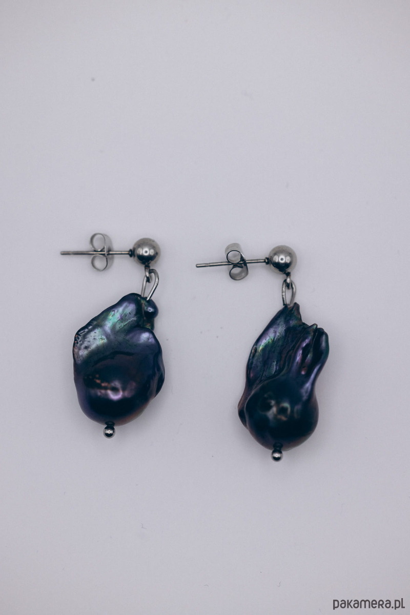 Ręcznie wykonane kolczyki z perłami naturalnymi baroque w kolorze czarnym mieniącym się odbiciami światła w perłowych kolorach .