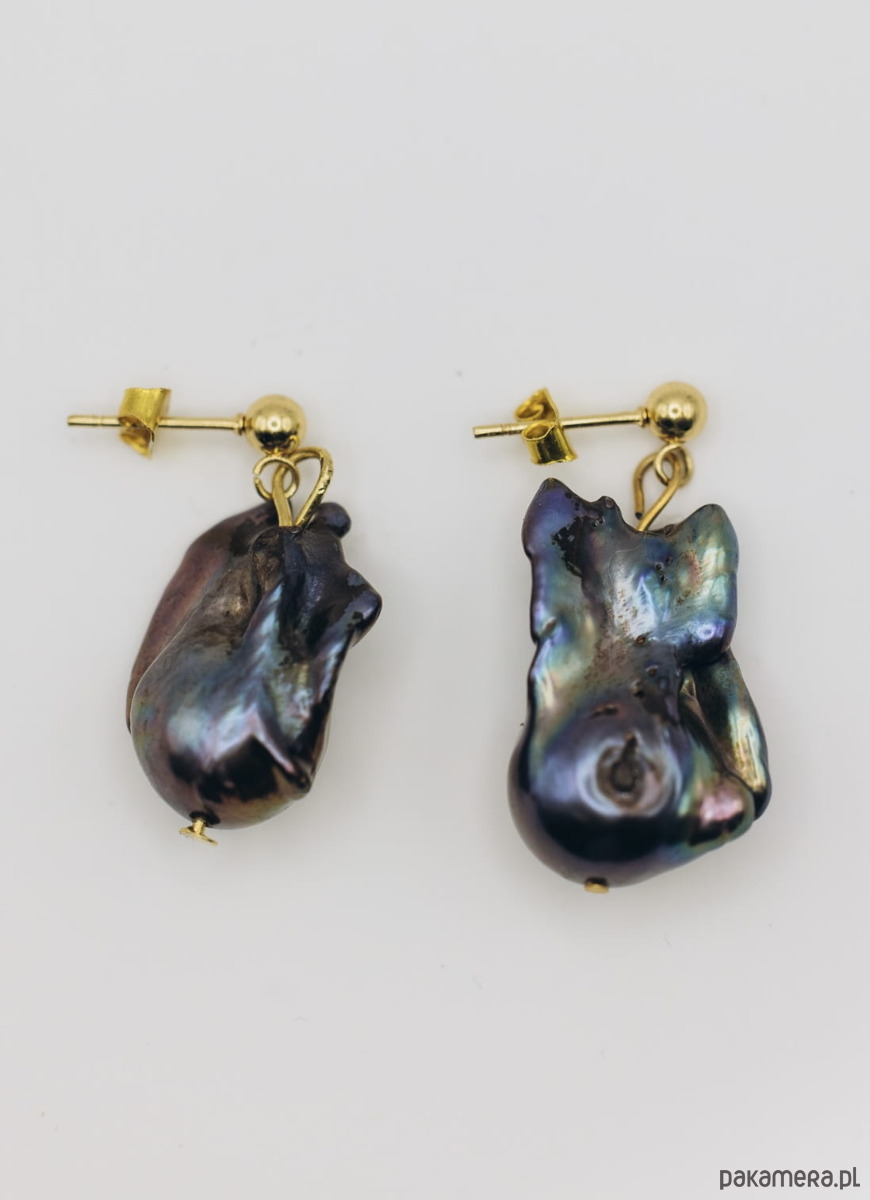 Ręcznie wykonane kolczyki z perłami naturalnymi baroque w kolorze czarnym mieniącym się odbiciami światła w perłowych kolorach .