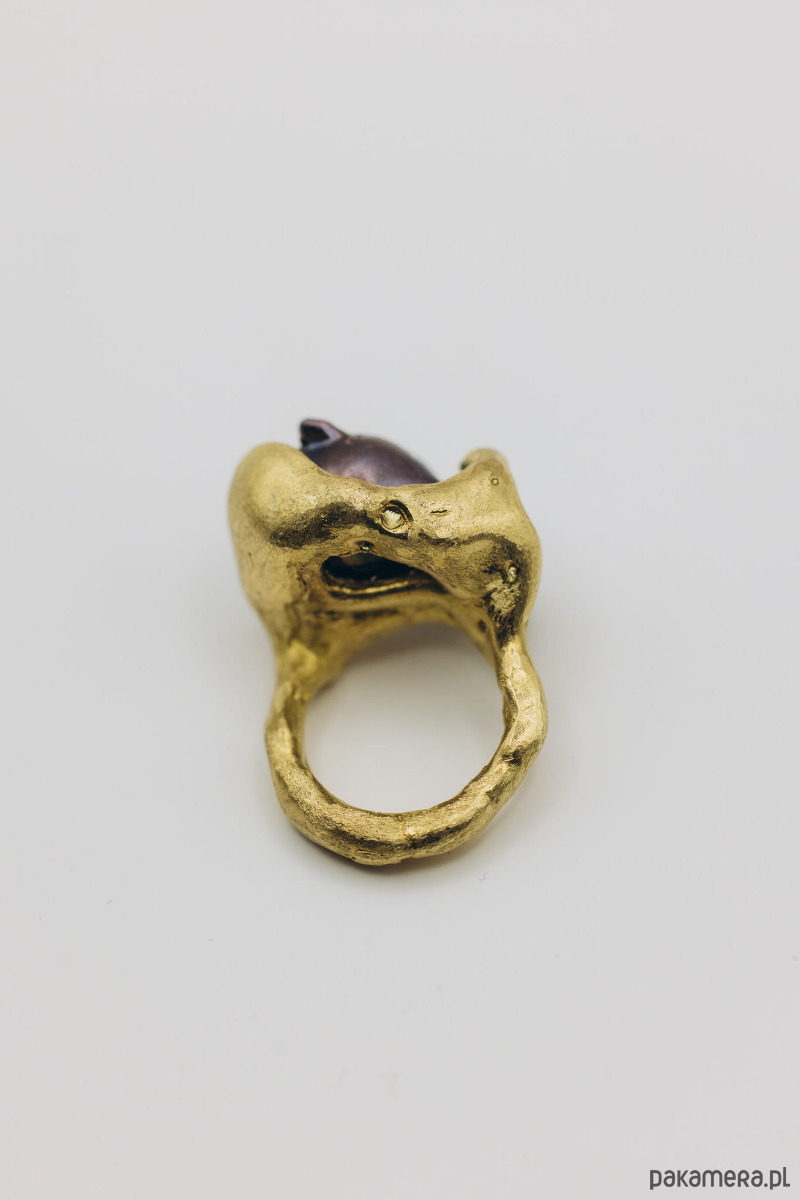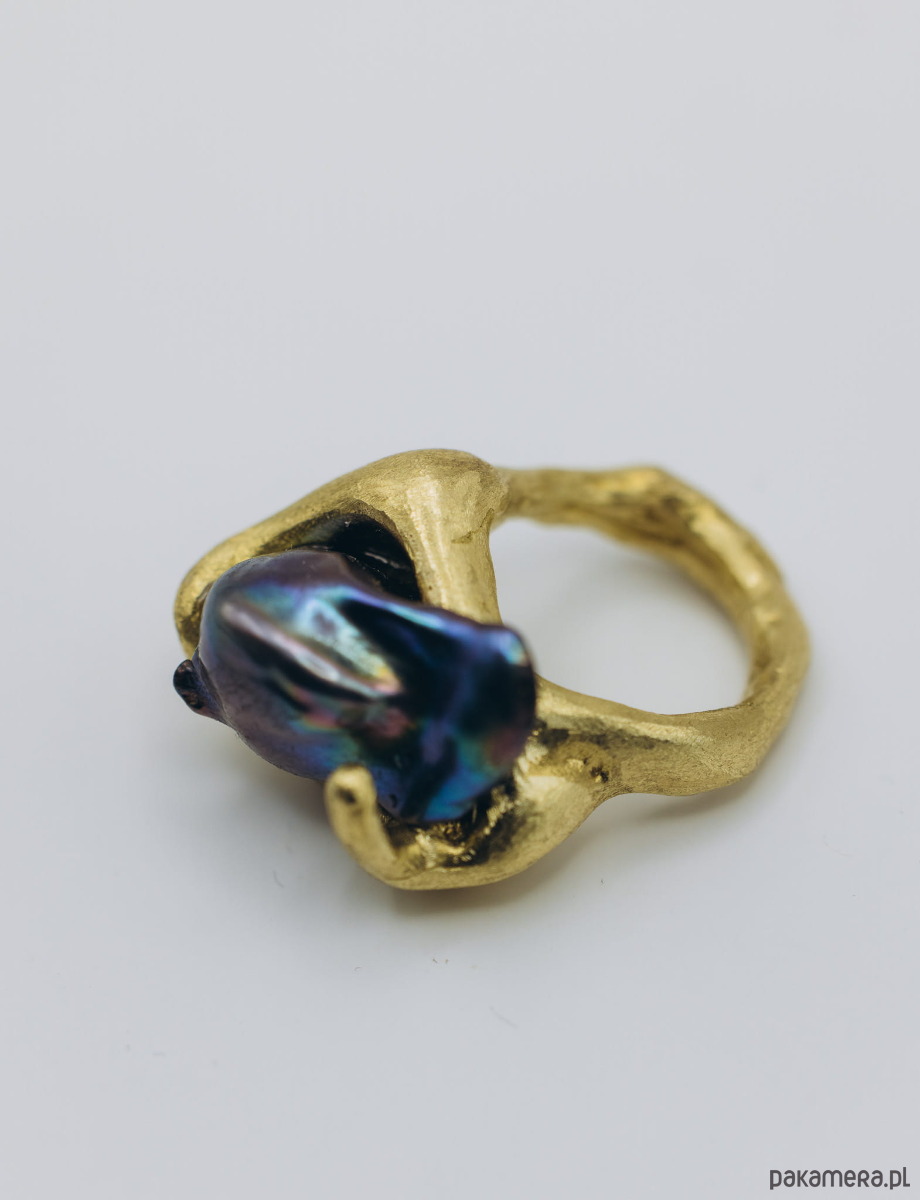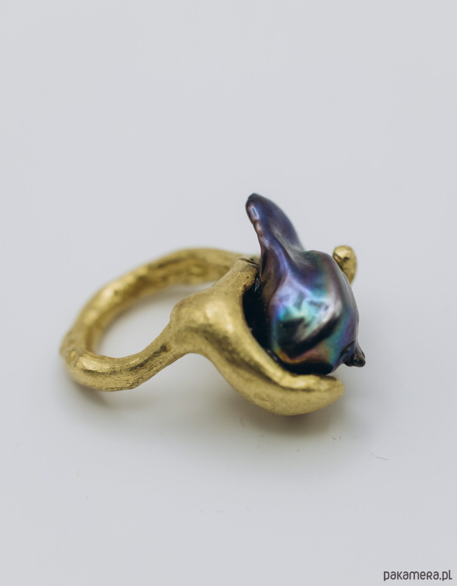 Ręcznie wykonany sygnet metodą wosku traconego. Materiał: mosiądz + perła naturalna baroque.
