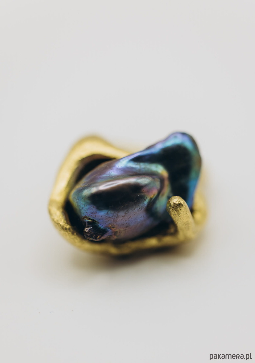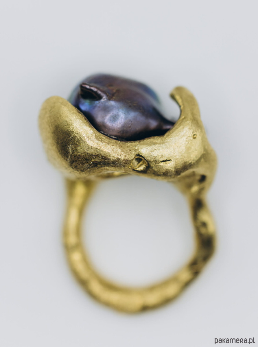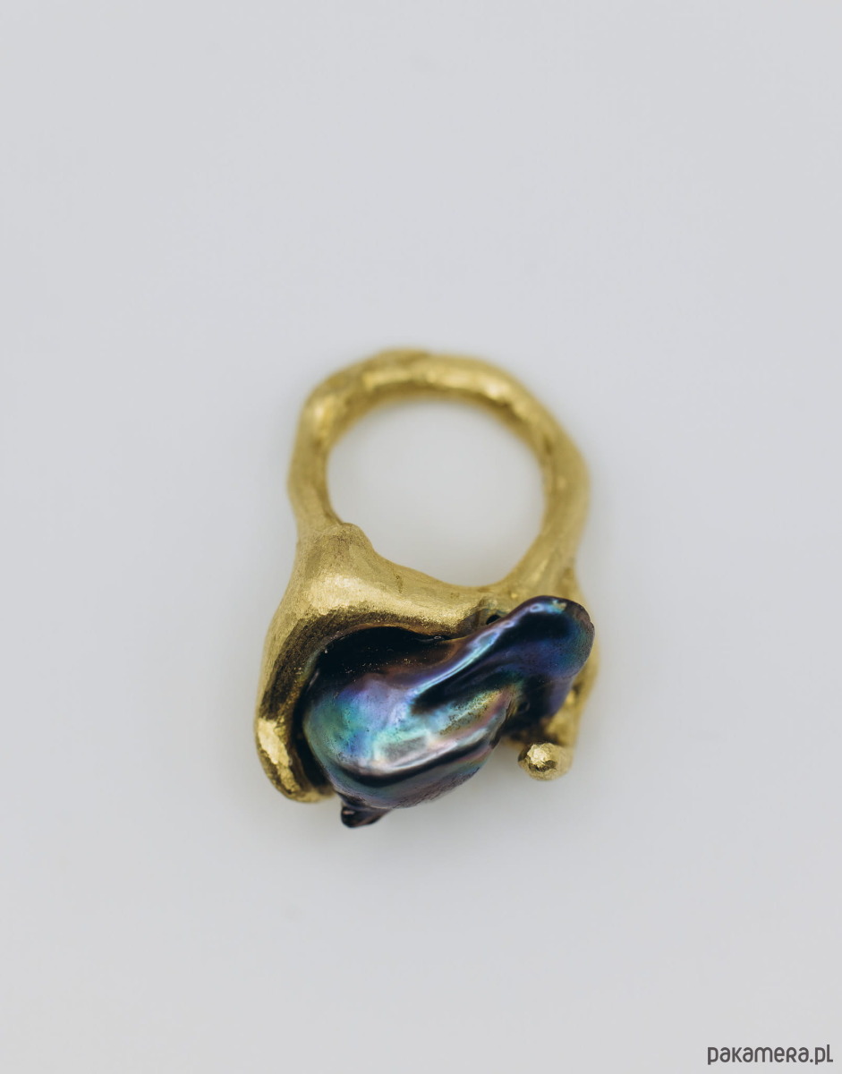 Ręcznie wykonany sygnet metodą wosku traconego. Materiał: mosiądz + perła naturalna baroque.